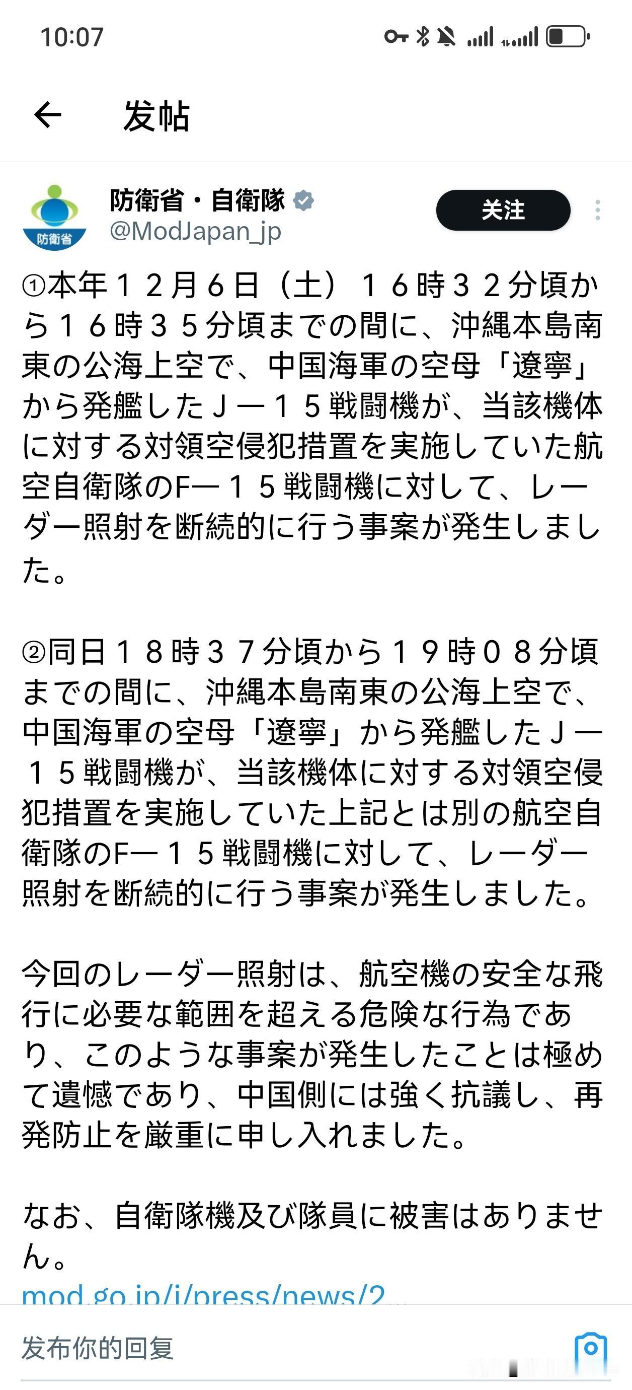 12月6日(星期六)16:32至16:35,一架从中国海军辽宁号航空母舰上起飞的歼-15战斗机在冲绳岛东南公海上间歇性照射了一架正在对其实施空域侵犯措施的航空自卫队F-15战斗机。事件发生时,一架歼-15 战斗机从中国海军 "辽宁 "号航母上起飞,对正在对其实施空域侵犯措施的航空自卫队一架 F-15 战斗机实施间歇性雷达照射。 (2) 同日 18 时 37 分至 19 时 08 分左右,一架歼-15 战斗机从中国海军 "辽宁" 号航空母舰上起飞,飞越冲绳岛东南公海上空,并间歇性地照射了另一架 正在对该飞机实施侵犯领空措施的航空自卫队 F-15 战斗机。这起事件涉及对一架航空自卫队的 F-15 战斗机进行间歇性雷达照射,当时该飞机正在对其实施侵犯领空的反制措施。 这种雷达照射是一种危险行为,超出了飞机安全飞行所必需的范围,发生这样的事件令人极为遗憾。 自卫队飞机及其人员没有受到任何损害。