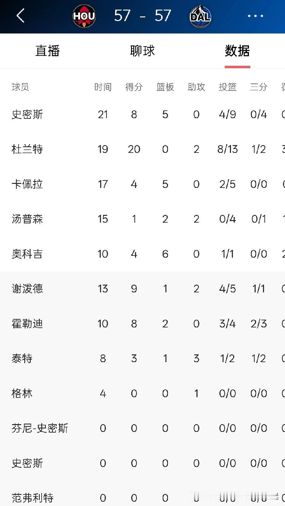 半场结束火箭57-57与独行侠打平。本场比赛可以说火箭打的相当吃力,除了杜兰特一