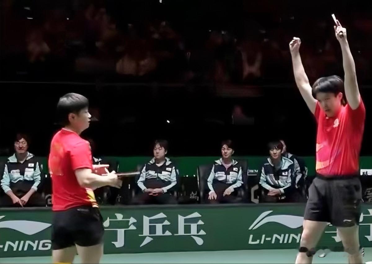 王楚钦/孙颖莎3比0吴晙诚/崔孝珠,三局比分:11-9、11-8、12-10 成都混团世界杯中国队迎战韩国队的半决赛中,国乒接下来的出场为蒯曼、林诗栋的单打,如有必要男双王楚钦梁靖崑、女双王曼昱蒯曼。 这个出场顺序还是很科学的,王楚钦不打男单,避免了与男双的连场转,能够有两场单打的恢复精力时间。同样王曼昱不打女单,全部精力去拿下女双的三局比赛。 瞧莎莎瞅着大头的兴奋劲,他们如同其他国乒队员一样,无论是混双还是单打以及双打,每一个项目都是在为国争光!