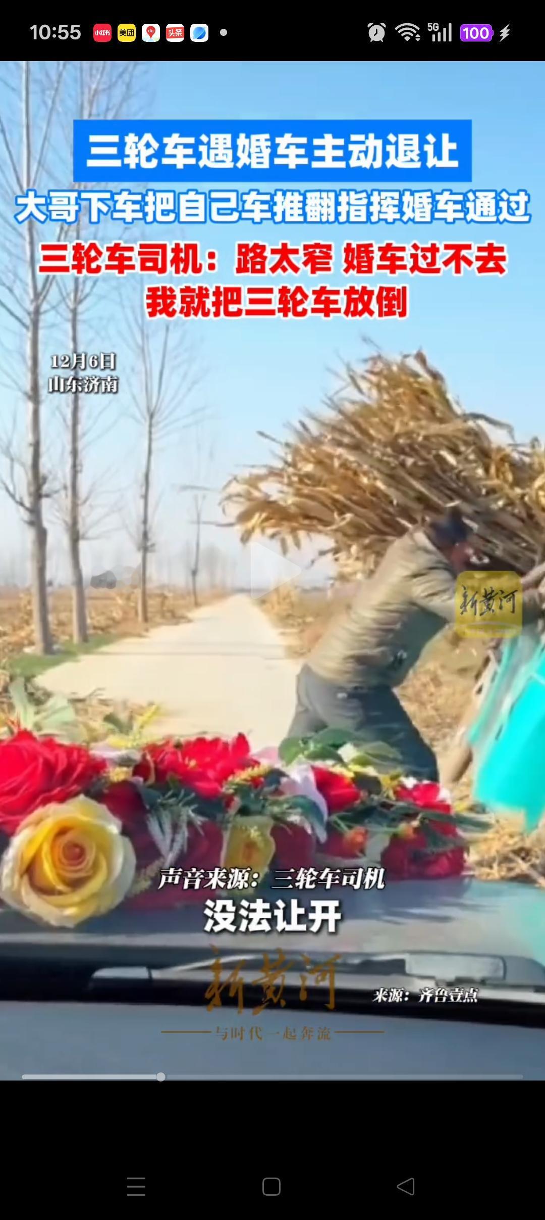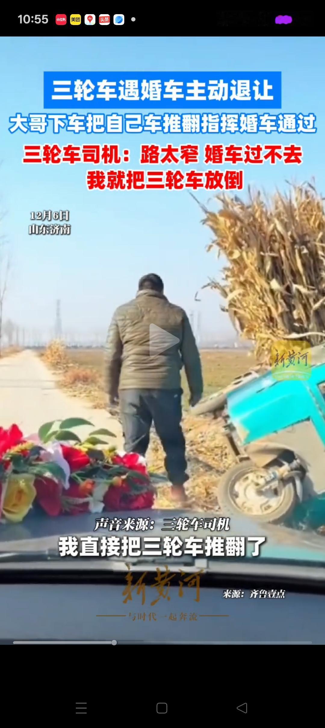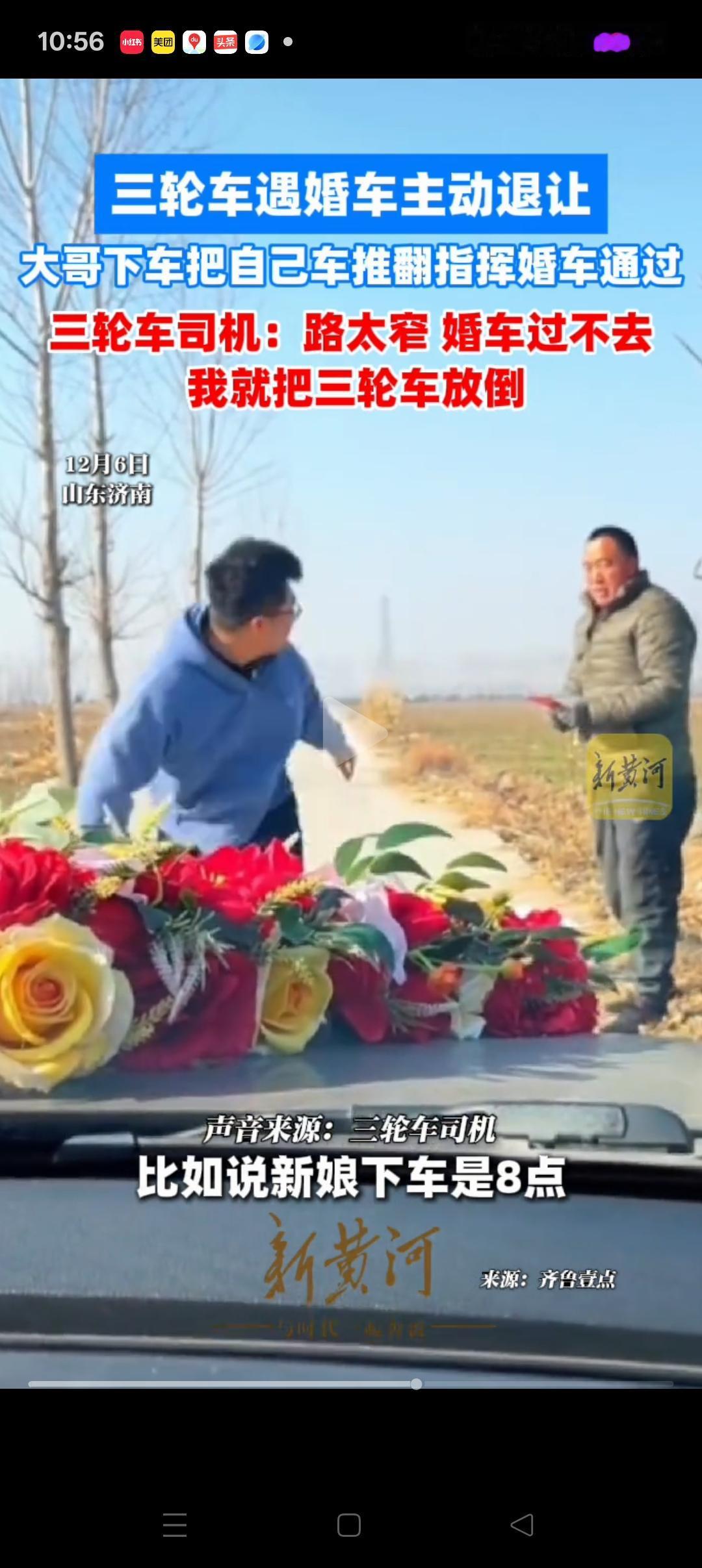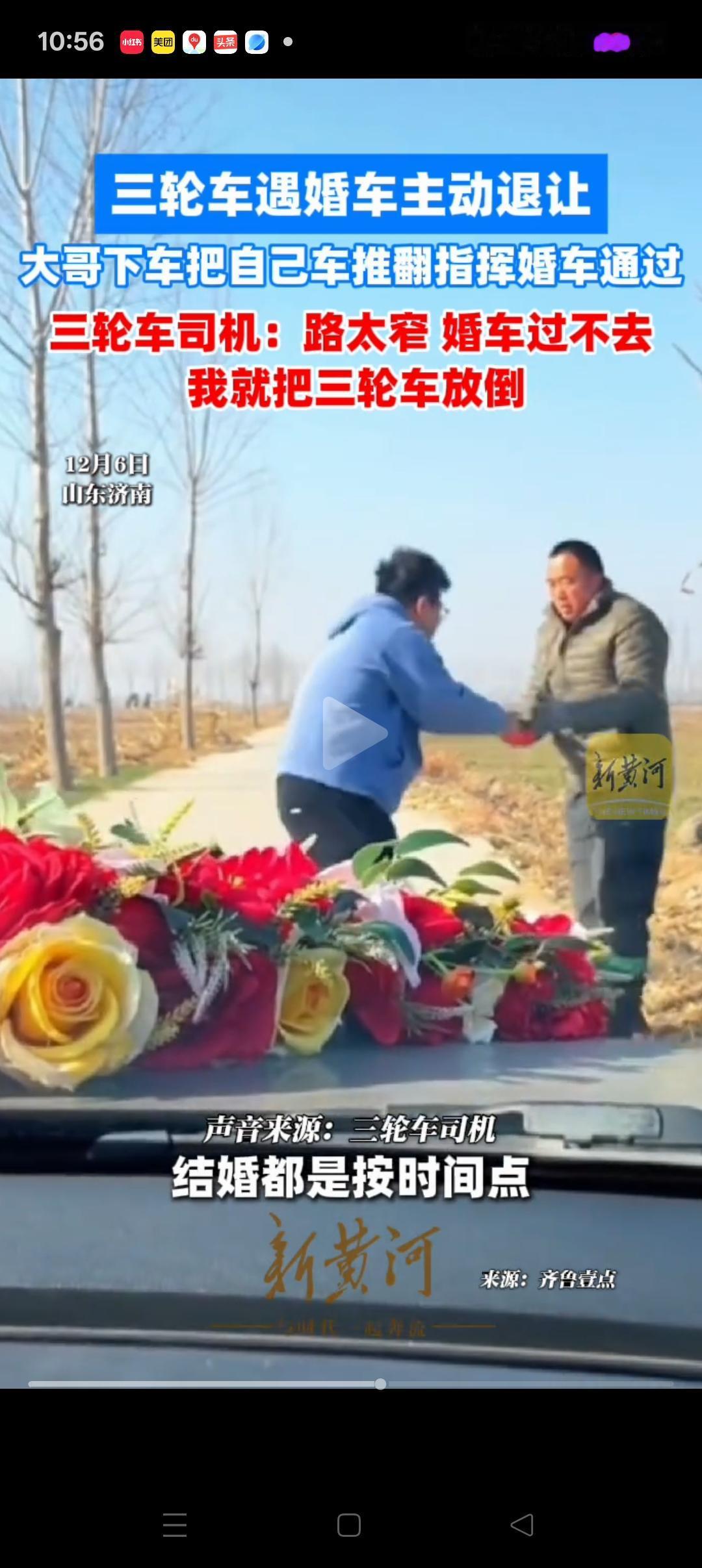 “都是讲究人”,济南,一三轮车偶遇婚车路过,因为道路比较窄,于是大哥立刻推倒了自己的三轮车给婚车让行。婚车的亲属也很讲究,立马下车给司机包了个红包,并连连示意谢谢。大哥拿到红包也是乐呵呵的,甩着手目送婚车离开。 新郎也说了,婚车是不能走回头路的。本来还想着怎么跟大哥解释,没想到大哥根本不犹豫,直接推倒了自己的三轮车,自己也是非常感动,感慨还是好人多。 其实生活中经常会遇到这样的事情,如果都能够像大哥这样做就好了,有人情味也有幸福感。 这位大哥一看就是憨厚朴实善良的人,尊重传统文化,还善解人意 这一举动不仅温暖了新人的婚礼,也温暖的人心,必须点赞[赞][赞]