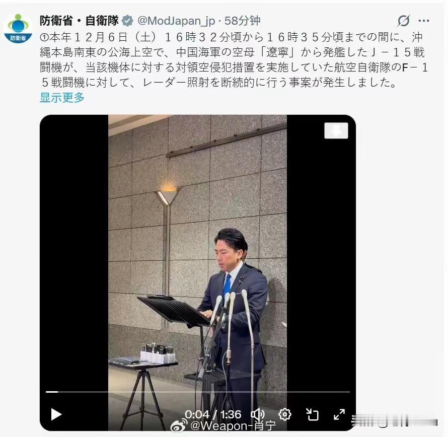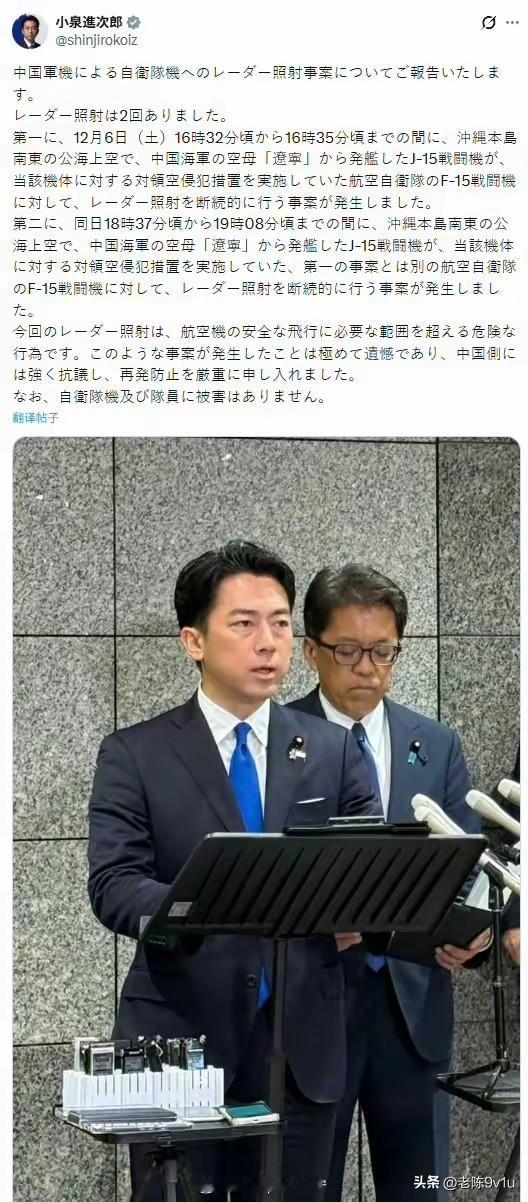 3. 日本向中方提出强烈抗议 称中国航母火控雷达照射日战机:日本防务省凌晨开记者会控诉,12月6日傍晚及2小时后,琉球群岛东南国际水域,中国辽宁舰歼-15用火控雷达照射日本F-15,还提强烈抗议;可日本说地点是公海却扯领空侵犯,自相矛盾,明明是其F-15主动挑衅,中方正常应对,它欲加之罪、卖惨自讨没趣。