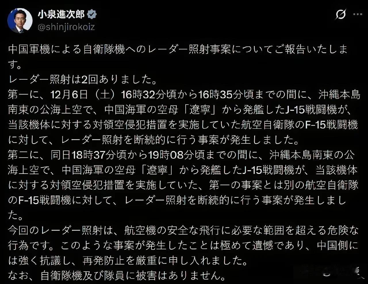 日本防相小泉进次郎提出严重抗议,因为他们的战机被我们的雷达照射,他认为这是非常危险的行为!对于日本的挑衅行为,绝对不惯着。他们的战机到我们干扰我们正常通行,严重侵犯我们合法权益,没有对其进行打击,而只是进行雷达照射,发出警告而已,如果他们在雷达照射的驱赶下仍能不予悔改,不撤出对我们的干扰,对其雷达照射还是最轻的。中国军人不挑事,但是也不怕事。对于日本的挑衅行为,必须予以坚决的回击,否则他们会把我们的宽容认作是软弱。