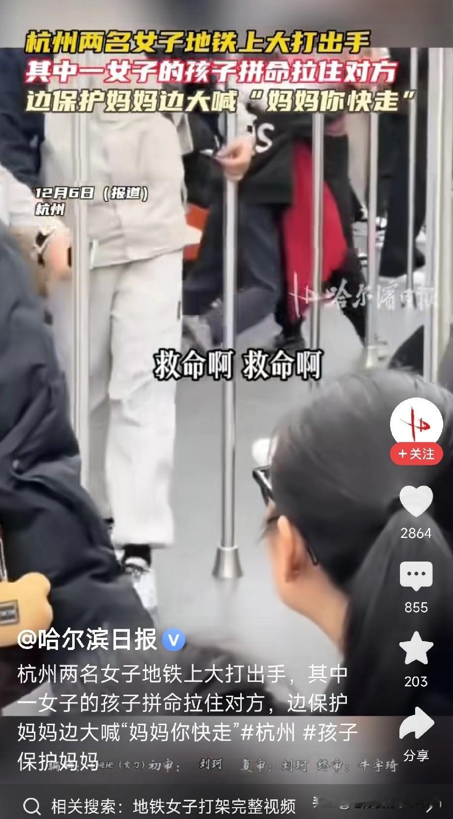杭州地铁惊心一幕! 今天刷到一条新闻,心里五味杂陈。杭州地铁上,两个妈妈竟然当着孩子的面大打出手! 视频里,一个穿红衣服的妈妈和一个穿白衣服的妈妈揪着头发撕扯,旁边的小女儿吓得直哭,小小的身子拼命抱住对方阿姨,边拉边喊:“妈妈你快走!妈妈你快走!” 声音都带着颤音,看得人心都揪起来了… 说真的,两位妈妈的素质真是堪忧啊!大人之间有什么矛盾不能好好解决?非要动手? 当着孩子的面这样,想过孩子的感受吗?孩子那声“快走”不是在拉架,是在用尽全力保护妈妈啊! 小小年纪,本应躲在妈妈怀里撒娇的年纪,却要在慌乱中被迫“长大”… 想想都心疼。 带娃出门,真的要学会忍一忍。就算受了委屈,也别和人起冲突。 赢了架,输了孩子的安全感;输了架,更让孩子害怕。 孩子眼中的世界,本应是温暖可靠的,可一旦看到信任的妈妈和陌生人扭打在一起,那恐惧和阴影,可能一辈子都抹不去… 希望所有的家长都记住: 带着孩子出门, “母亲”这个身份就自动加载了“榜样”的设定。 哪怕受了天大的委屈,争执的底线也应是:不当着孩子的面,让情绪这个野兽出笼。 你的冲动,孩子买单; 你的冷静,孩子安心。 别让孩子在慌乱里被迫长大! 因为我们的“输赢”,代价可能是孩子世界的崩塌。 他今天的挺身而出是爱,但明天,这份爱会不会变成对“冲动”的模仿? (文章素材来自哈尔滨日报,侵删)