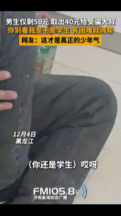 “你别看我是学生,有困难就得帮!”12月4日,黑龙江,男生在外遇到一位受骗大叔坐在地上哭,于是男生把自己仅剩的50元钱,取出40元给受骗大叔,大叔看男生是个学生,不肯要这个钱。 于是男生就说:“你别看我是个学生,谁遇到困难不帮一把,大叔这钱你就安稳拿着。”但大叔还是不肯拿,于是男生就把这钱硬塞到大叔手里,让他先坐车回家再说。 男生看出大叔愧疚的自尊心,便说实在不行就留个电话号,等你有钱了再还我也行,大叔这才把钱收下,又不停地向男生道谢。 男生诚恳的样子与贴心的话语既帮助了大叔,又给他留足了自尊和面子,他虽然还是少年,但说话的口气特别像家里的长辈,一听就是个善良又可靠的人。 这才是真正的少年气!少年强则国强,这个孩子以后差不了,为他点赞!