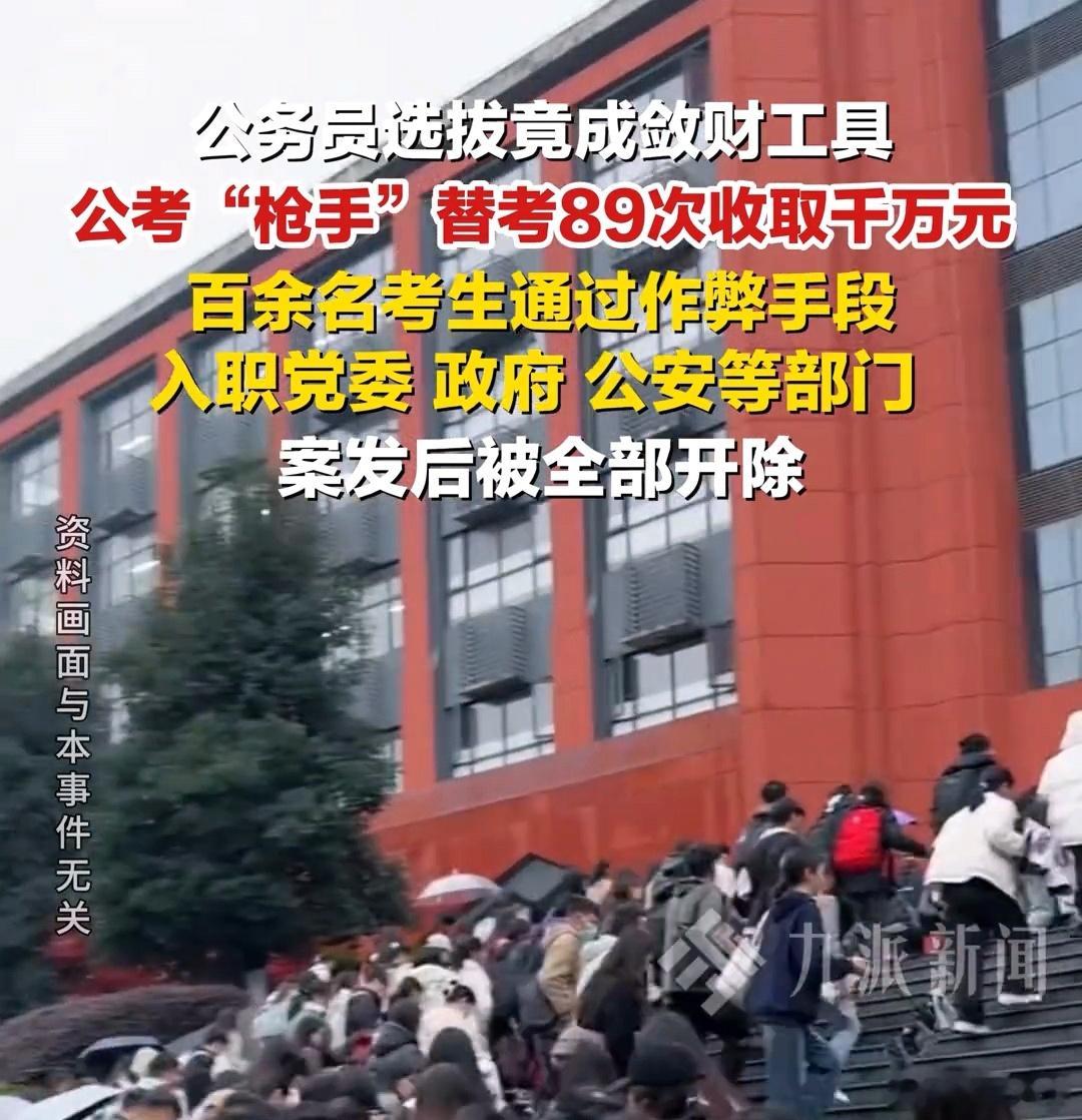 公考枪手团队替考89次获利千万,百余名考生通过作弊手段入职党委、政府、公安、农村基层组织等部门,案发后全部被开除公职。(如此高效,还是有点震惊!)毕业论文、考公、考编“作弊”,完全是给我自己埋雷,从此以后随时可能爆雷。尤其是这类“枪手”,早晚会落网,一旦案发不仅会被开除公职,还将拉入黑名单。自以为小聪遇到了厉害枪手,其实愚蠢至极。公考枪手团队替考89次敛财千万热点观点