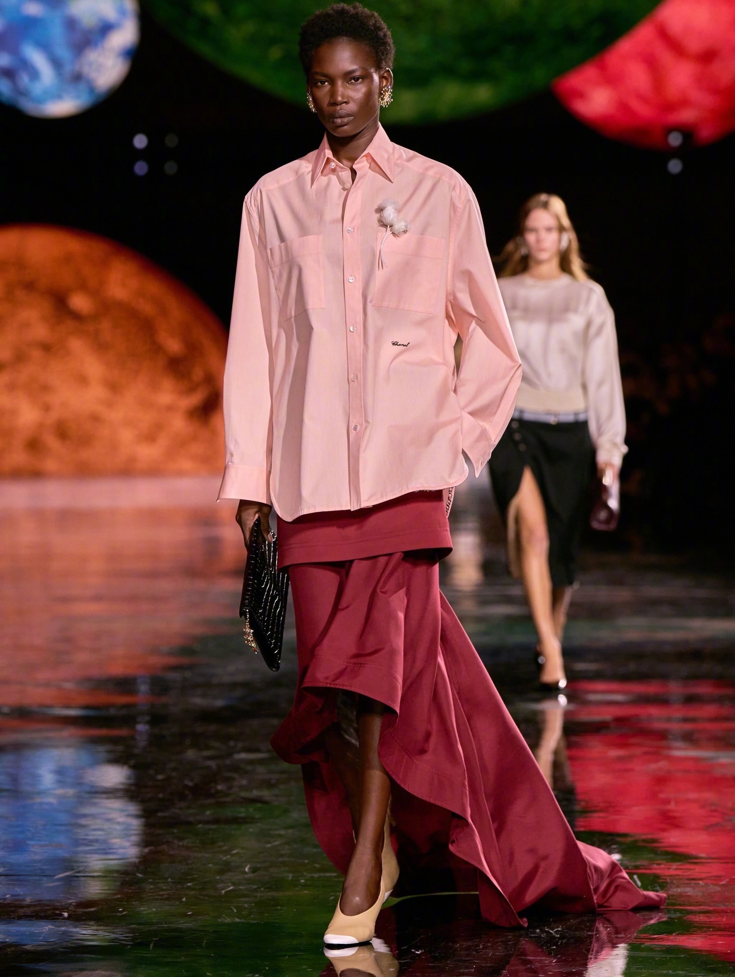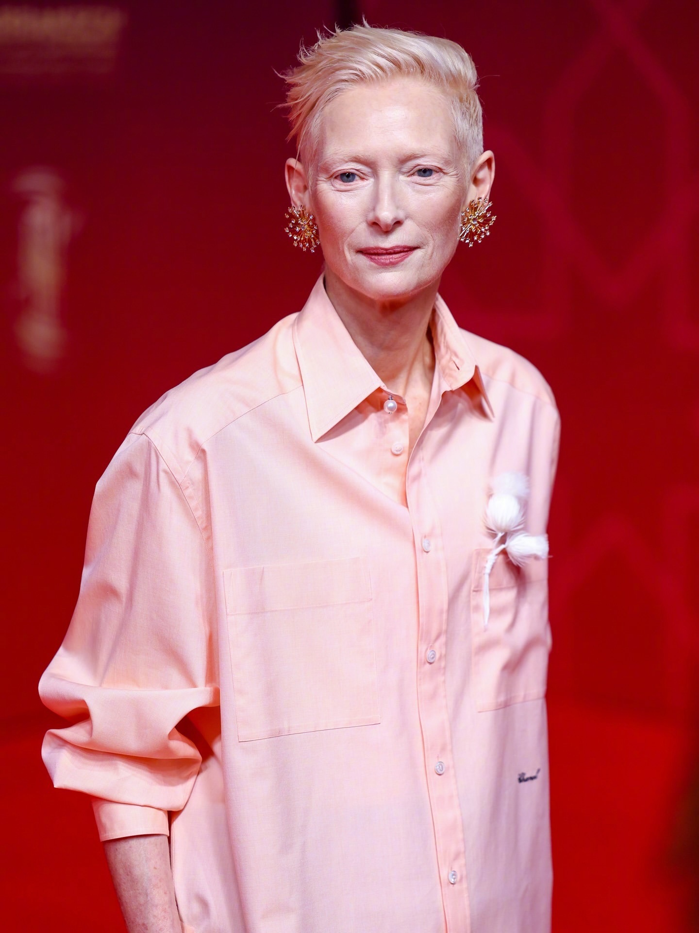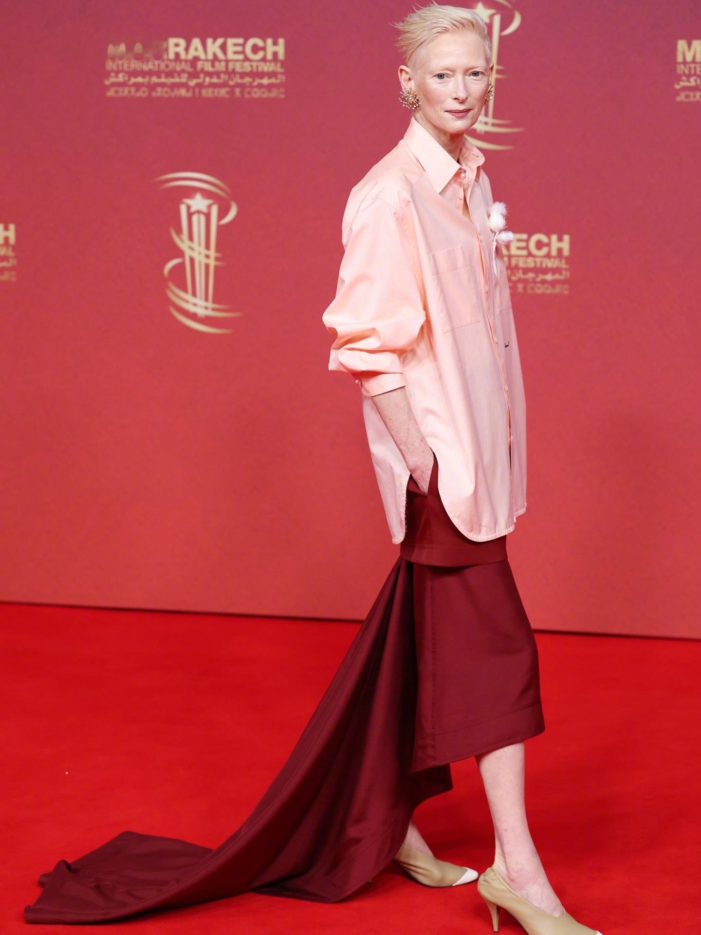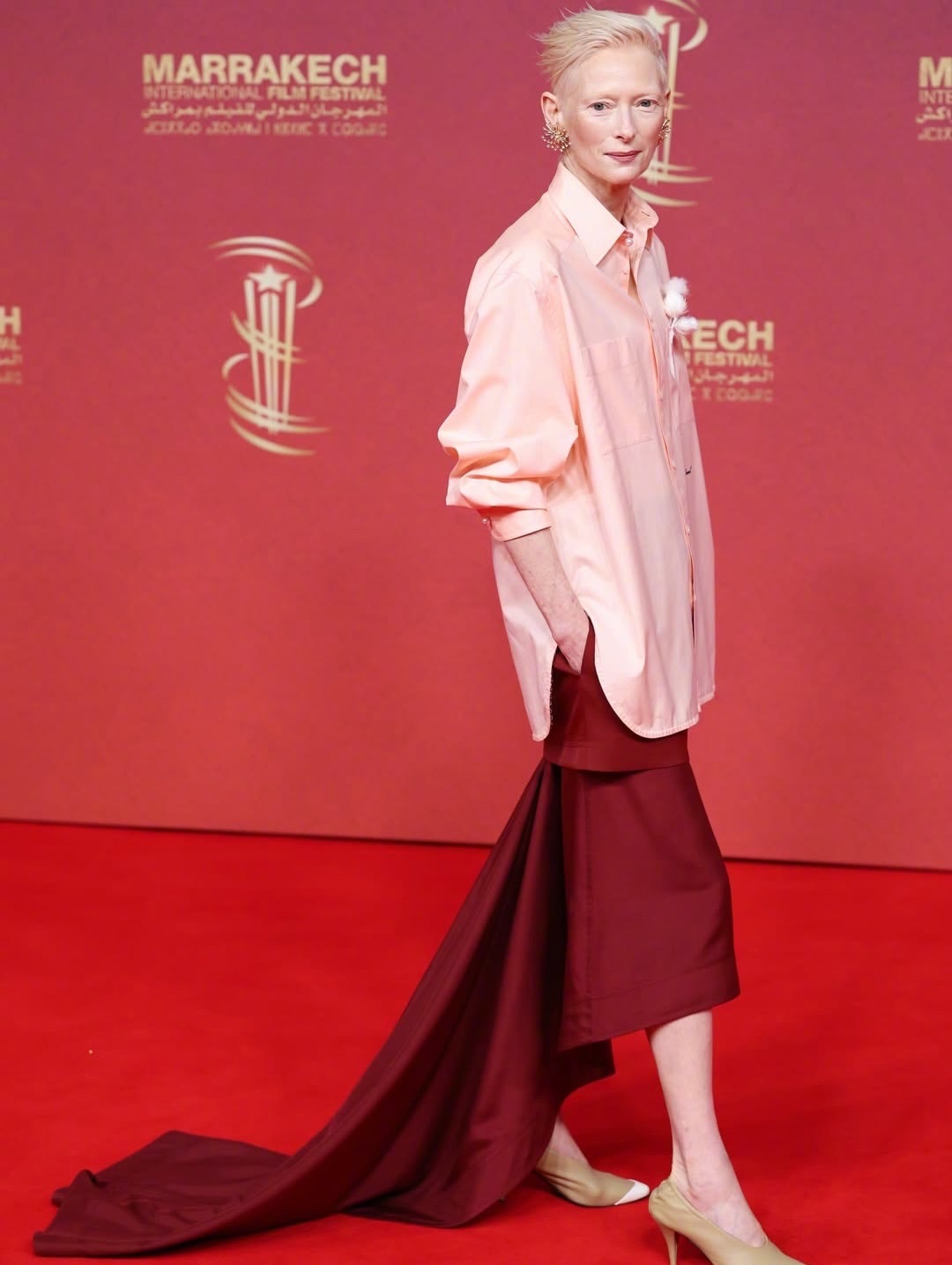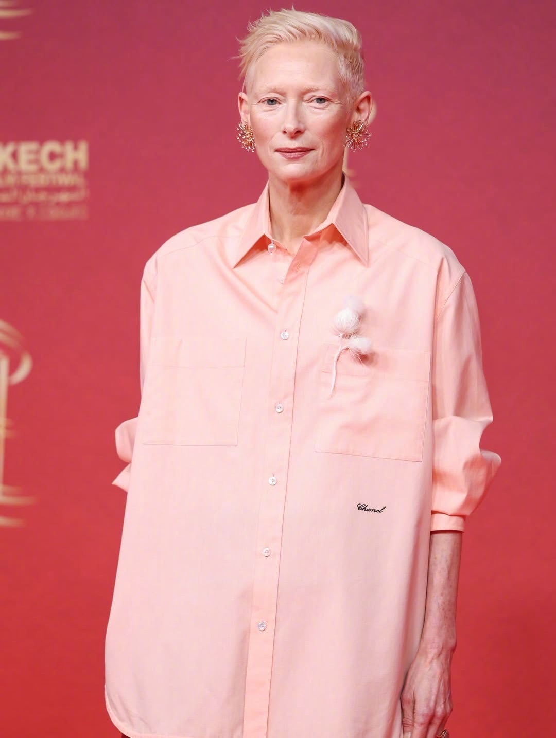 Tilda Swinton 亮相 2025马拉喀什国际电影节,身着 新任创意总监Matthieu Blazy 设计的 Chanel 2026 春夏系列—-利落的粉色扣式衬衫搭配高低裙,这一套换个人可真诠释不出这份精致优雅和贵气从容范儿。米拉服饰解析