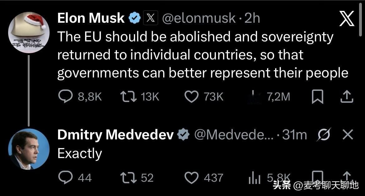 马斯克与梅德韦杰夫在社交平台上互动,马斯克认为欧盟应该取消,各个国家保持独立,让人民代表自己的国家。梅德韦杰夫回帖表示:正确。 马斯克曾表示,欧洲的官僚机构实际上比美国更多,因为欧洲不仅有省级和国家级机构,还有欧盟。 坦白地说,欧盟总部本质上就是一座巨大的官僚主义大教堂,臃肿得不得了,决策和反应都非常慢。欧洲可能比美国更需要提高效率,这就需要在国家层面和欧盟层面都进行改革。在欧洲,这项工作比在美国更难,过度监管就像慢性自杀,严重阻碍了欧洲的进步和创新。 这是一种缓慢的窒息,不会在某个瞬间觉得一切都结束了。但套在脖子上的绳索每年都会收紧一点,最终它会扼杀欧洲。欧洲确实必须立即采取行动,在欧盟层面、国家层面和地方层面减少监管。