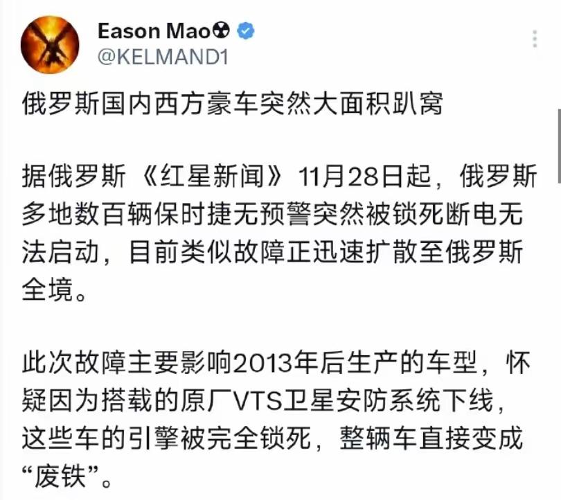 这么大的事,我们的新闻怎么不搞起来。这件汽车直接被锁死的事件,以十分有力的证据证明西方的汽车是不安全的产品。想一想都不寒而栗,你用西方的汽车,相当于把命交到人家手中,随便出个车祸就把你灭口了。 反过来,如果同样的事出现在中国汽车身上,大家信不信,西方媒体一定会把这样的消息炒到天上去。甚至于,西方国家的政府还会站出来搞制裁,并推及到其他中国产品头上。 之前某西方车企就出过类似问题,有车主反馈高速上突然被远程限制动力,车企却只轻飘飘说“系统误判”。人命关天的事,到他们那连句正经道歉都没有。 再看看数据,去年全球汽车安全投诉里,西方品牌远程控制相关的投诉量比中国品牌高37%。这还只是公开的数据,多少没被曝光的问题,车主可能到现在都蒙在鼓里。 西方总喊着“技术透明”,可他们的车机系统代码从来不对公众开放。说是保护知识产权,本质就是怕别人发现里面藏着的“后门”,毕竟远程锁车、操控车辆的权限全在他们手里。 还记得几年前某中国电动车在海外出了小事故,西方媒体连夜发通稿,连“威胁公共安全”的帽子都扣上了。结果调查发现是车主操作失误,那些媒体连个更正声明都没发。 更双标的是,西方政府还动不动拿“安全”当借口打压中国车企。去年欧盟搞的反补贴调查,拿不出实锤证据,就硬说中国车“存在数据安全风险”,本质就是怕中国车抢了他们的市场。 中国车企不一样,不管是比亚迪还是蔚来,车机系统的核心安全模块都会交给第三方机构检测,结果全公开。有问题就改,从不会像西方车企那样藏着掖着。 之前有位老司机说,开中国车最放心的就是,哪怕车机出问题,也能手动切换到机械模式,不会被远程锁死。这种把主动权交给车主的设计,才是真的为安全考虑。 西方总说自己的产品“高端安全”,可这次汽车锁死事件彻底露了馅。他们的安全是“选择性安全”,只保自己的利益,根本不管消费者的死活。 我们不是要刻意抹黑谁,只是想让大家看清真相。买汽车不是买玩具,是买个能保障自己和家人安全的工具。连基本控制权都不在自己手里的车,再贵也不能要。 各位读者你们怎么看?欢迎在评论区讨论。汽车质量问题 汽车品牌危机 汽车防锁死 汽车安全争议 汽车质量危机 车辆真相大揭秘 汽车界乌龙事件
