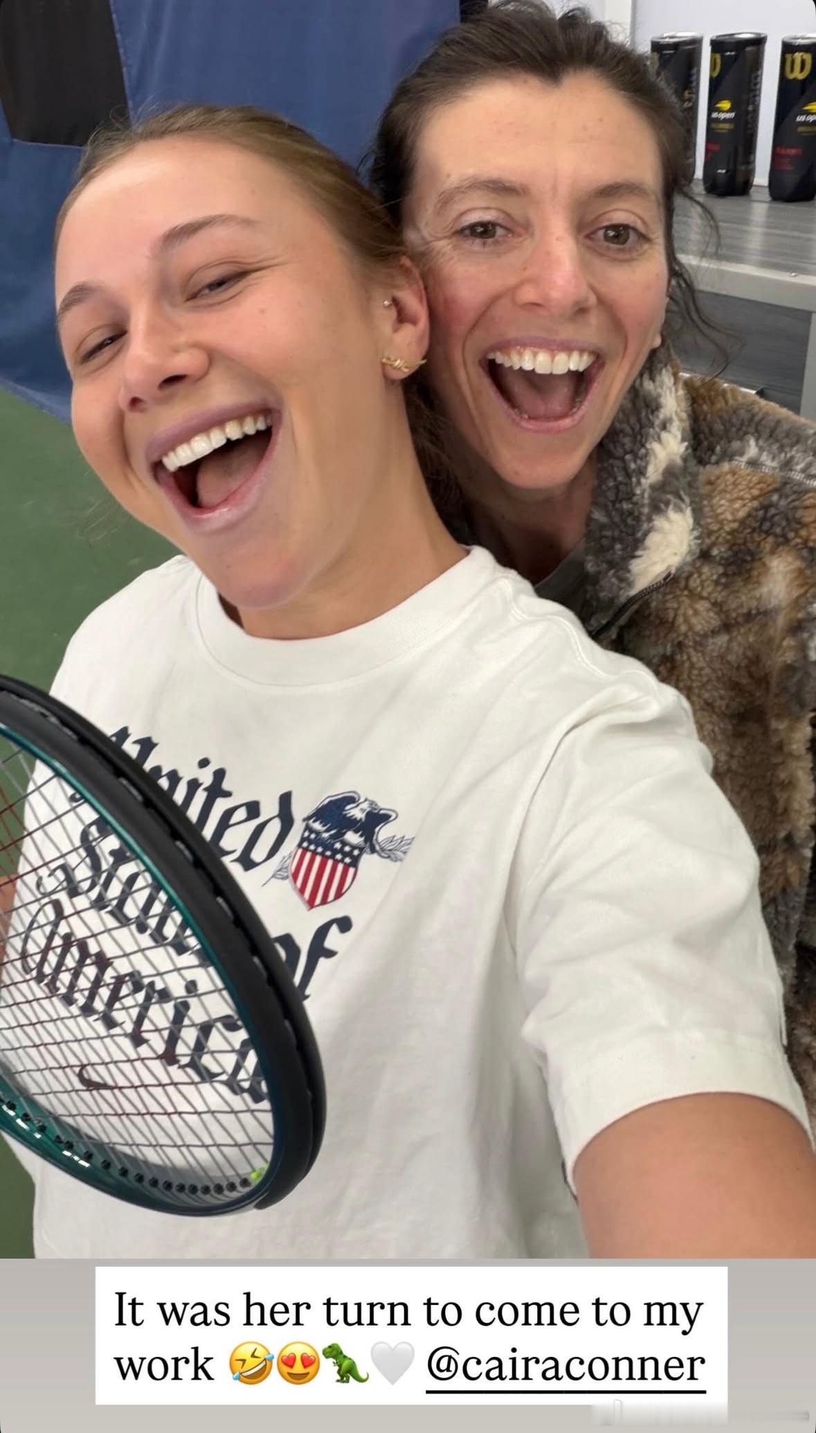 阿尼西莫娃!今日行程安排-网球训练课🎾今天Amanda在训练期间还迎来了一位好朋友-Caira Conner,一位著名的写手!曾经为Amanda撰文,为很多知名杂志供稿……“今天是Caira来观摩我工作的一天!”Amanda写的文案wta