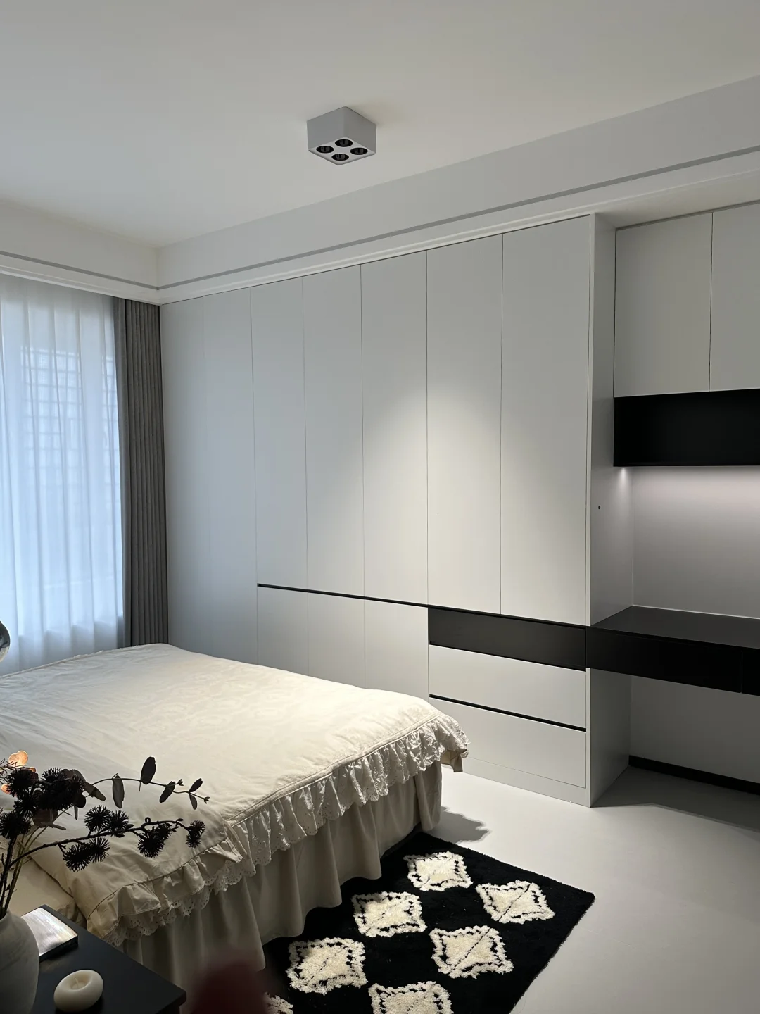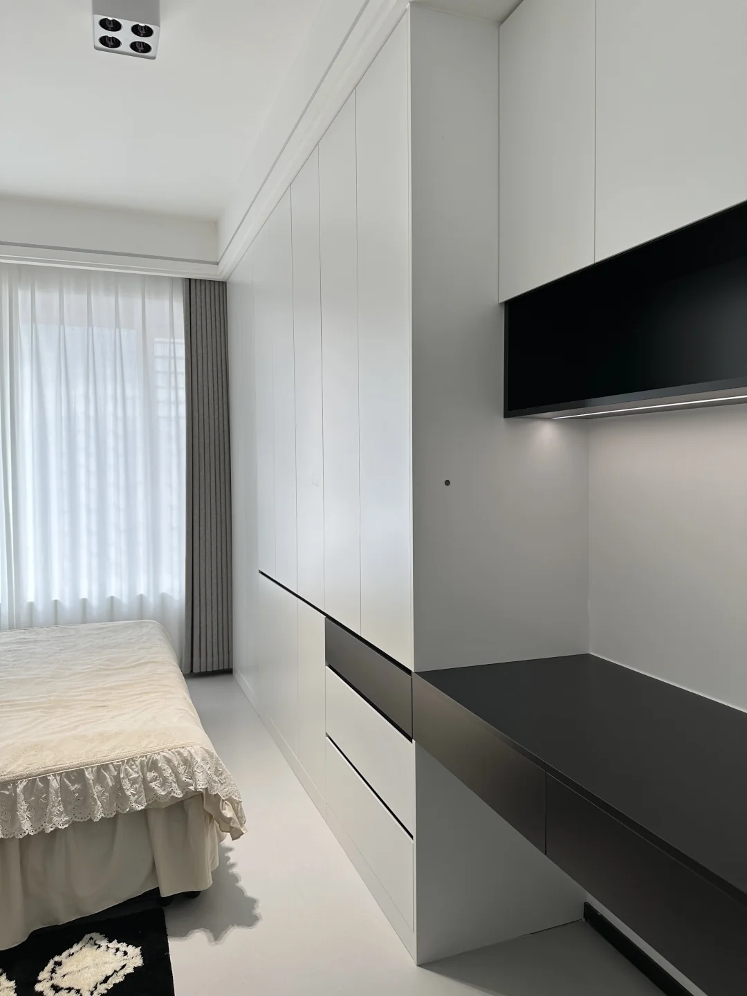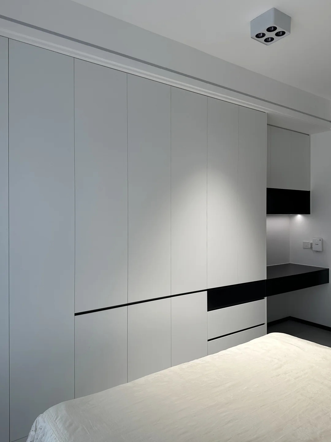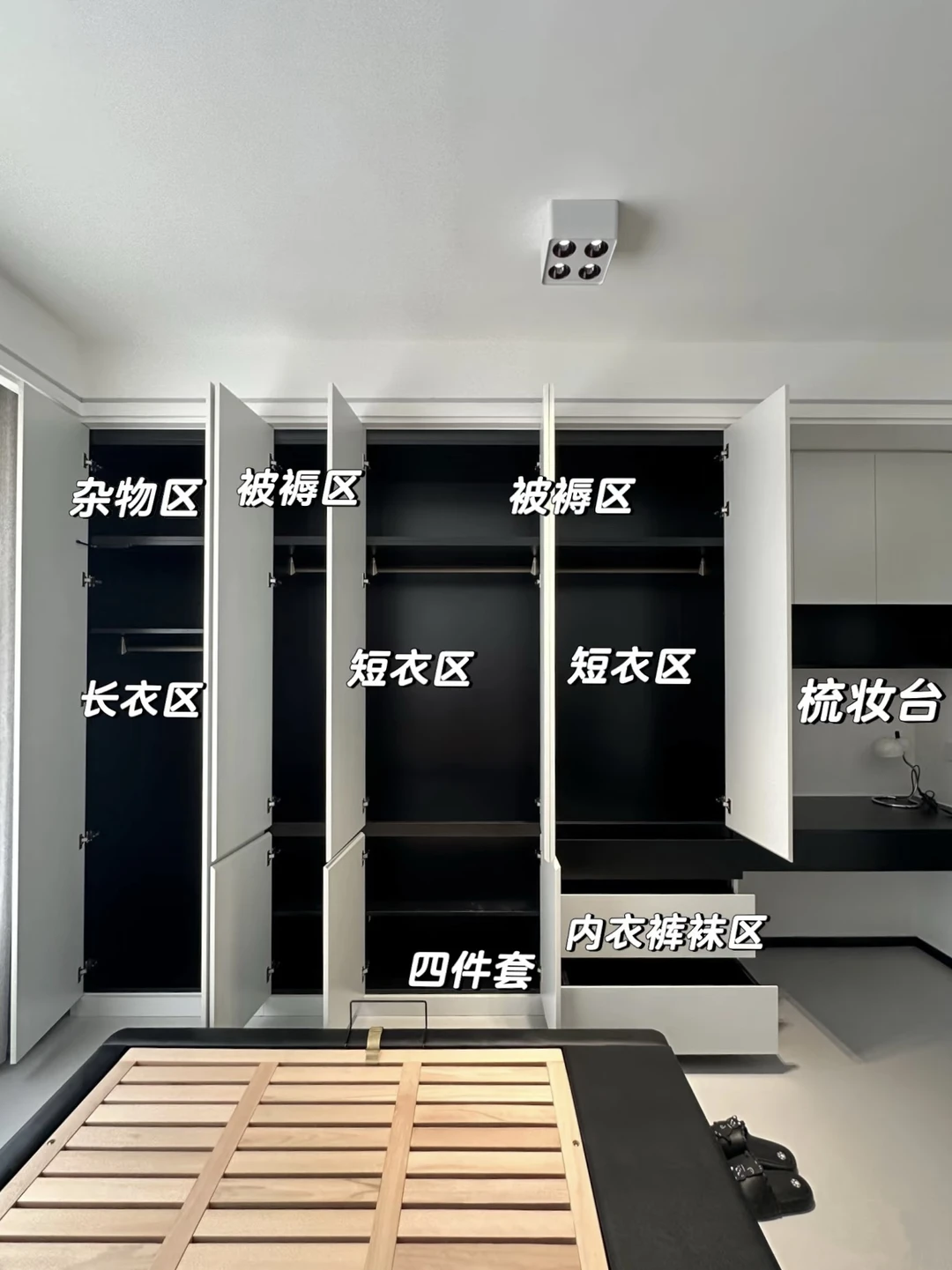 14平主卧,开间3.2米 不做L型衣柜卧室更通风采光更好 没想到床尾衣柜这么实用 堪比衣帽间 衣柜是黑➕白搭配,无拉手设计 梳妆台靠卫生间那边,空间更松动 衣柜的设计很简约,没有花里胡哨 白色为主色视觉上一点也不压抑 🧾 • 主卧空间:开间3.2m、宽度4.4m • 满墙衣柜:长4m、高2.48m、深55cm • 床具:1.8m(宽)×2.1m(总长) • 梳妆台:长1.2m • 过道剩余:50cm 衣柜尺寸大家可以参考一下哦 小户型也可以拥有满墙大衣柜