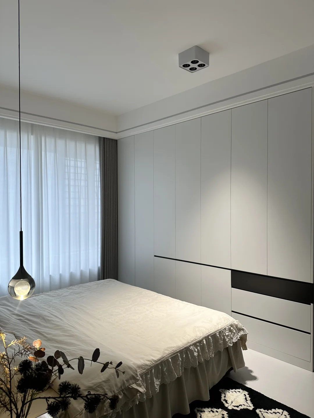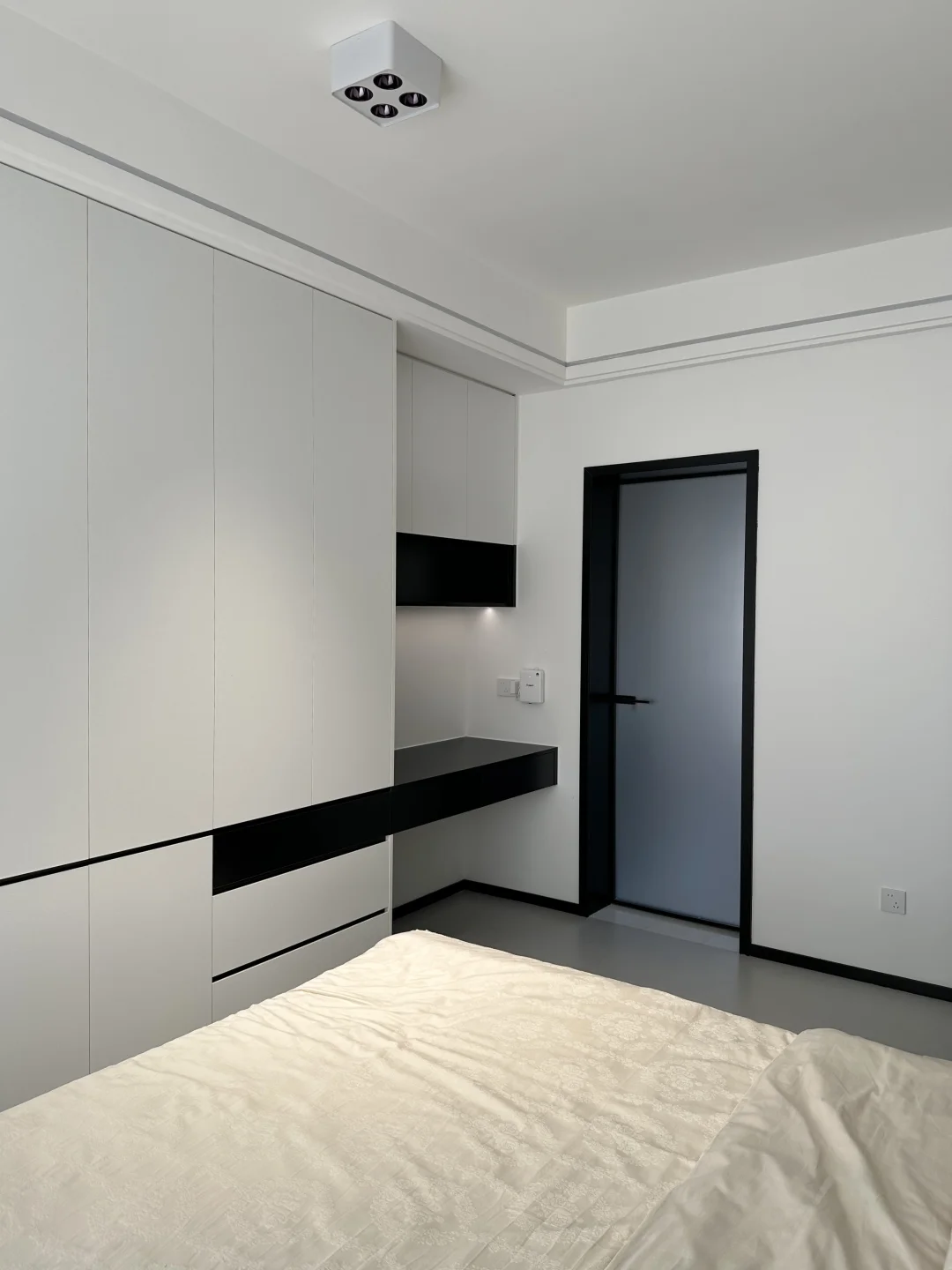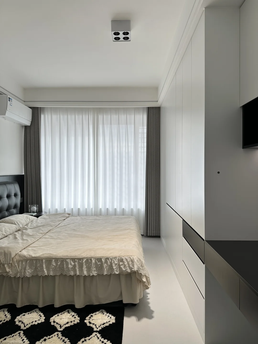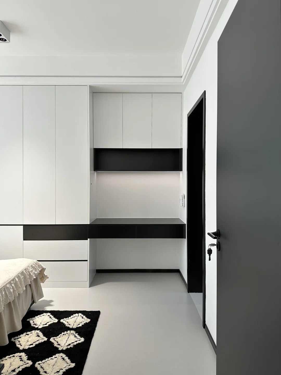 14平主卧,开间3.2米 不做L型衣柜卧室更通风采光更好 没想到床尾衣柜这么实用 堪比衣帽间 衣柜是黑➕白搭配,无拉手设计 梳妆台靠卫生间那边,空间更松动 衣柜的设计很简约,没有花里胡哨 白色为主色视觉上一点也不压抑 🧾 • 主卧空间:开间3.2m、宽度4.4m • 满墙衣柜:长4m、高2.48m、深55cm • 床具:1.8m(宽)×2.1m(总长) • 梳妆台:长1.2m • 过道剩余:50cm 衣柜尺寸大家可以参考一下哦 小户型也可以拥有满墙大衣柜