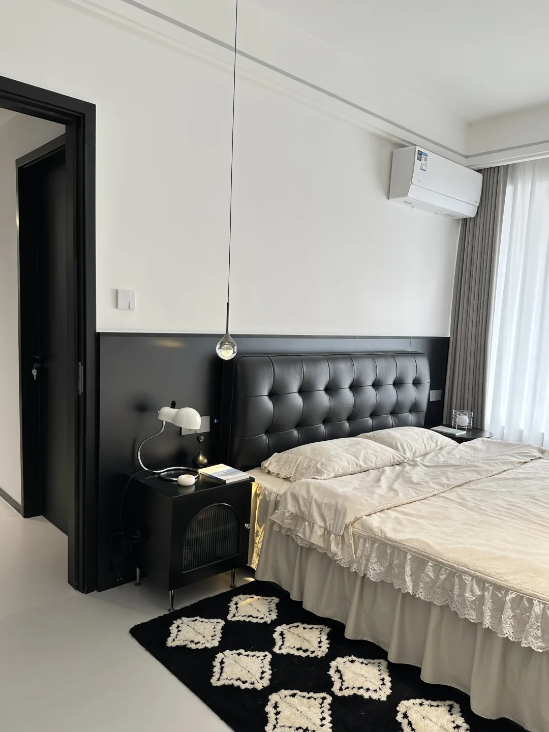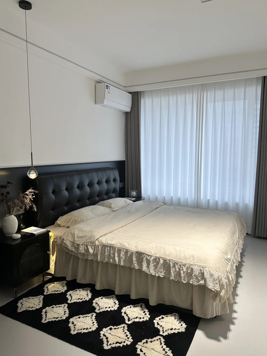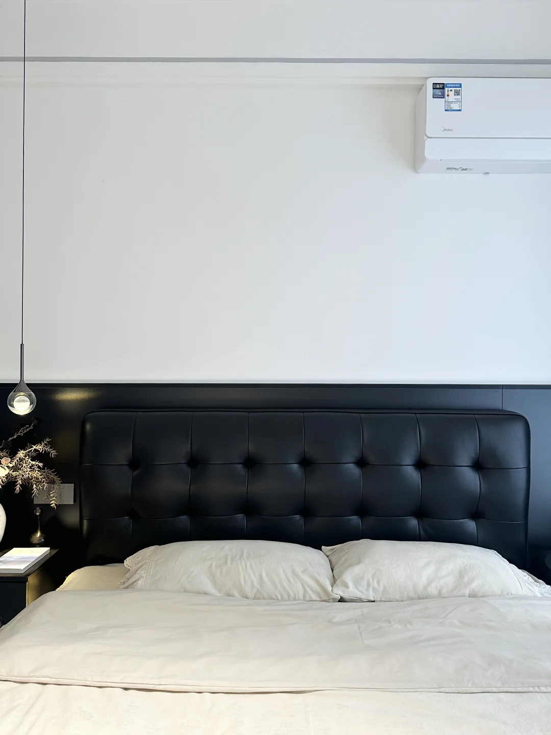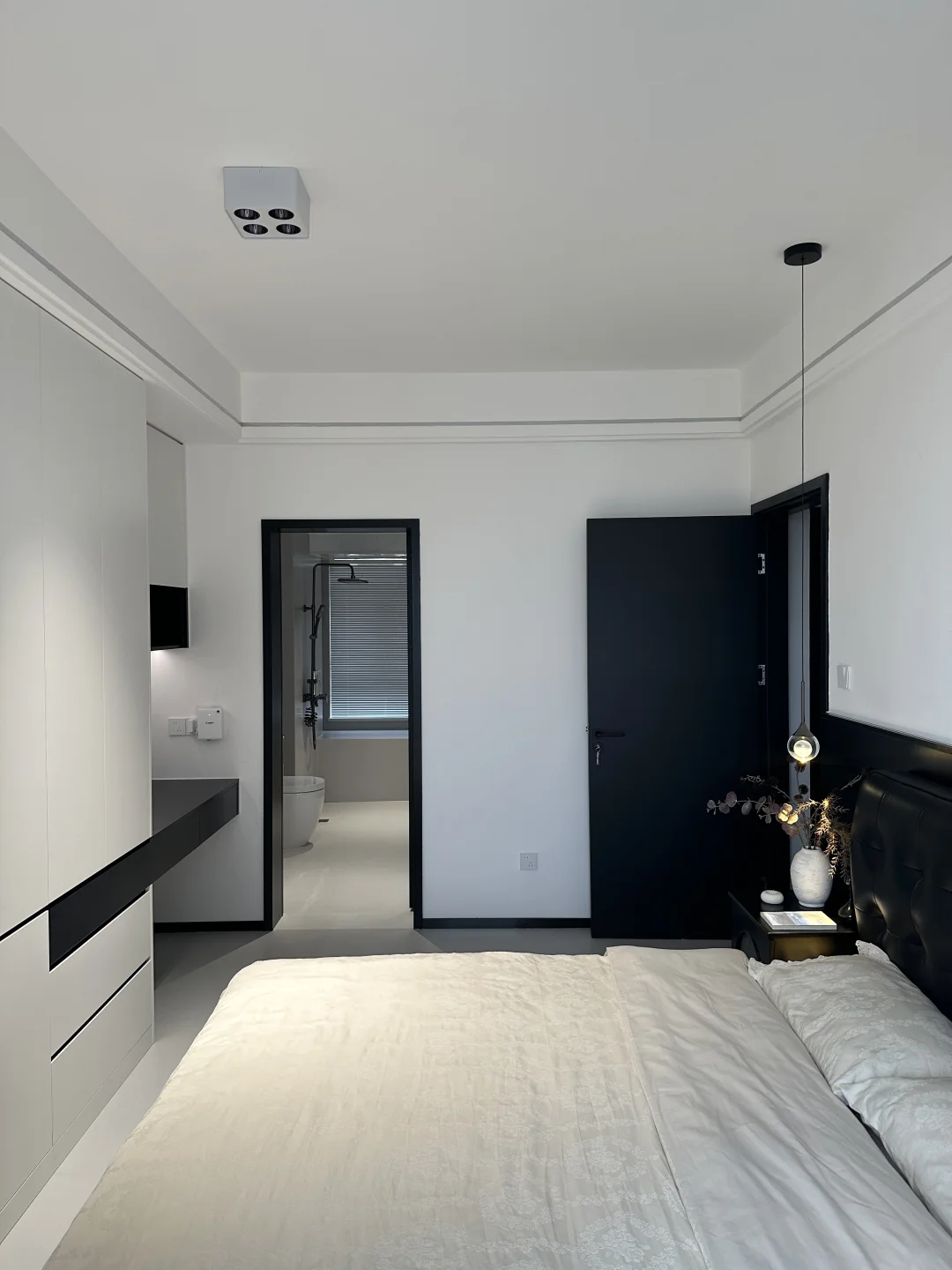 14平主卧,开间3.2米 不做L型衣柜卧室更通风采光更好 没想到床尾衣柜这么实用 堪比衣帽间 衣柜是黑➕白搭配,无拉手设计 梳妆台靠卫生间那边,空间更松动 衣柜的设计很简约,没有花里胡哨 白色为主色视觉上一点也不压抑 🧾 • 主卧空间:开间3.2m、宽度4.4m • 满墙衣柜:长4m、高2.48m、深55cm • 床具:1.8m(宽)×2.1m(总长) • 梳妆台:长1.2m • 过道剩余:50cm 衣柜尺寸大家可以参考一下哦 小户型也可以拥有满墙大衣柜