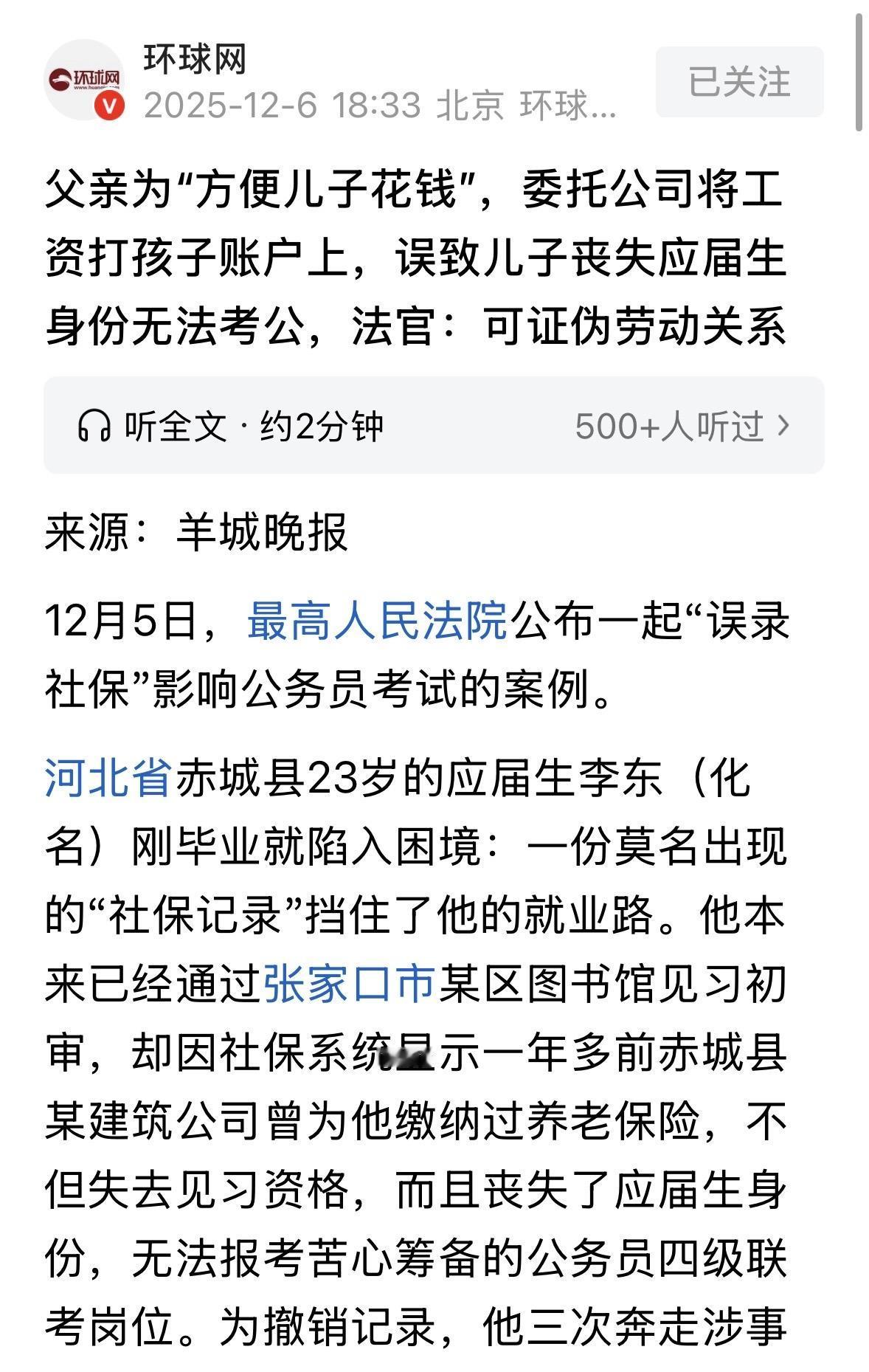 河北张家口,23岁男子毕业后通过了一图书馆的见习初审,谁料,社保系统显示一家公司曾给他交过养老保险,这下他失去应届生身份,不仅到手的见习资格没了,日后也无法再考公,然而,男子却喊冤称自己根本没在那家公司上过班,为了撤销记录,他半年内跑了3趟公司,去了人社局5趟,还申请劳动仲裁,可都被拒绝了,眼看公考报名日期越来越近,男子绝望了,觉得前途一片灰暗,直到案子到了法院,才终于迎来反转,男子万万没想到,竟是父亲曾经的一个决定,把自己给坑了! 去年,23岁的李东(化名)好不容易通过了张家口某区图书馆的见习生初审,他正满怀希望准备去上班,却突然接到通知,说他的社保记录显示已就业,不符合见习条件。 紧接着,他精心备考了半年的公务员四级联考报名也被驳回。 系统里显示,某建筑公司曾给他缴纳过养老保险缴费,这下好了,他的应届生也没了。 面对接二连三的打击,李东彻底懵圈了,他连那公司大门都没进过,更别说在那上班了,这养老保险缴费记录哪来的? 为了搞清楚到底咋回事,李东拿着毕业证、身份证,往建筑公司跑了三次。 人事来回翻名册,说根本没有“李东”这个人,财务室的人也表示,我们没给李东交过社保,你是不是搞错了? 这下事情更加扑朔迷离,李东又往县人社局跑了五趟,窗口的工作人员都认识他了。 不过,对方次次都说,系统里的记录是省库存的,我们基层没权限改。 李东没辙了,又申请劳动仲裁,仲裁委的人拿着他的材料,说你没有证据证明没在那上班,没法支持你。 眼看公考报名截止日期越来越近,李东绝望地坐在人社局的台阶上,看着天上的云飘来飘去,觉得自己的未来也像云一样,没个着落。 他非常沮丧,半年了,自己跑了这么多地方,却始终没有一个结果,他感觉自己的路被堵死了。 材料转到法院时,离报名截止只剩7天。接手的法官一看,这事儿得赶紧办呀!不然赶不上报名了。 法官带着助理往建筑公司跑,旧工资台账堆得厚厚一层,两人挨个翻,在翻了3个小时,人事专员突然拍了下大腿,说自己想起来个事儿。 就在去年年底,公司有个姓李的老师傅,说自己不会操作手机转账,就让他们直接把工资打到他儿子李东的卡里,这样儿子需要用钱了也能直接用。 恰好财务申报社保时,也是有点粗心,没核对劳动关系,就顺手把李东的名字填上去了。 这样一来,事情彻底真相大白了。 李东的父亲回想起来也满是懊悔,说都怪我!去年在建筑公司打工,嫌麻烦让公司把工资打儿子卡里,哪想到后面会出这么多事,差点耽搁了孩子的人生大事啊! 法官想了想,说公考和见习看的是有没有真的上班,既然记录改不了,咱们就证明你没在那上班。 他给建筑公司和人社局打电话,商量解决办法。 第二天,建筑公司出了份书面说明,上面写着:李东未在我公司工作,社保记录系误录。因财务人员失误,将李东父亲的工资打入其账户并误报社保。 县人社局也根据法院的调查笔录,出了份补充证明:经调查,李东与某建筑公司无劳动关系,社保记录系误录。 3个月后,李东顺利接到了区财政局的录用通知。他特地对法官表示了感谢,要是没有法官的帮助,他这辈子怕是都没法考公务员了! 今年6月,李东度过试用期,成为财政局的正式工作人员。他穿着新制服,站在财政局的门口,想起之前跑断腿的日子,真是觉得像做了场梦。 有人说李师傅有可能挂证在别的单位,挂证单位给他交了社保。他在这个单位上班不能交社保,工资也容易查出来,干脆用儿子身份认证办个卡收工资,社保给儿子交上,反正他上大学又没社保。只是没想到影响了考公。 那么,从法律角度,怎么看待这件事? 《社会保险法》第83条规定:用人单位或者个人认为社会保险费征收机构的行为侵害自己合法权益的,可以依法申请行政复议或者提起行政诉讼。用人单位或者个人对社会保险经办机构不依法办理社会保险登记、核定社会保险费、支付社会保险待遇、办理社会保险转移接续手续,或者侵害其他社会保险权益的行为,可以依法申请行政复议或者提起行政诉讼。 李东因建筑公司误将其姓名录入社保系统导致“被就业”,直接侵害其应届生身份及考公资格,符合这条规定中的情形。 李东在多次奔走涉事公司、人社局无果后,通过法院诉讼途径主张权利,正是这条赋予的“提起行政诉讼”权利的体现。 这也警示所有用人单位,一定要严格规范社保登记流程,避免因为操作失误侵害他人权益。 对此,你怎么看? 关注@运良说法. 学法律知识不迷路