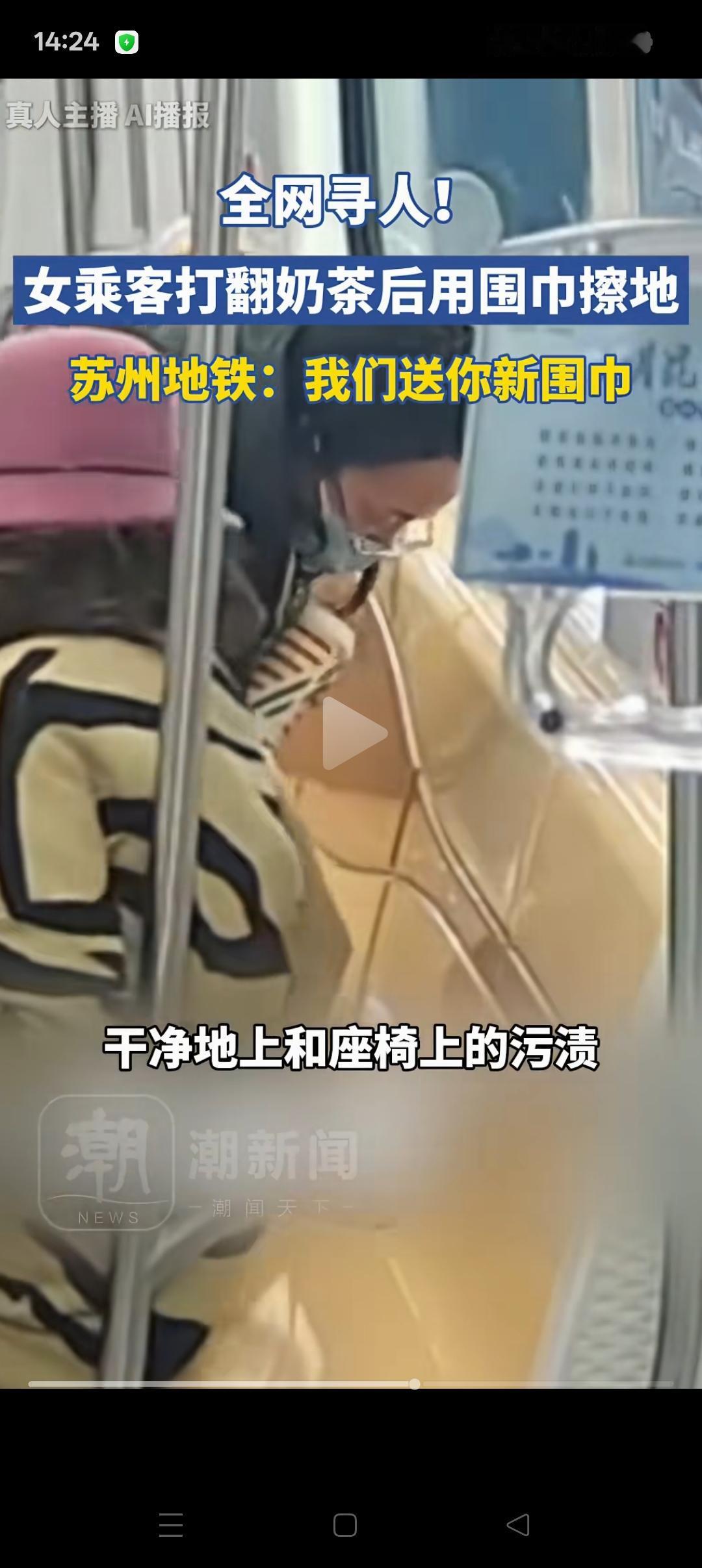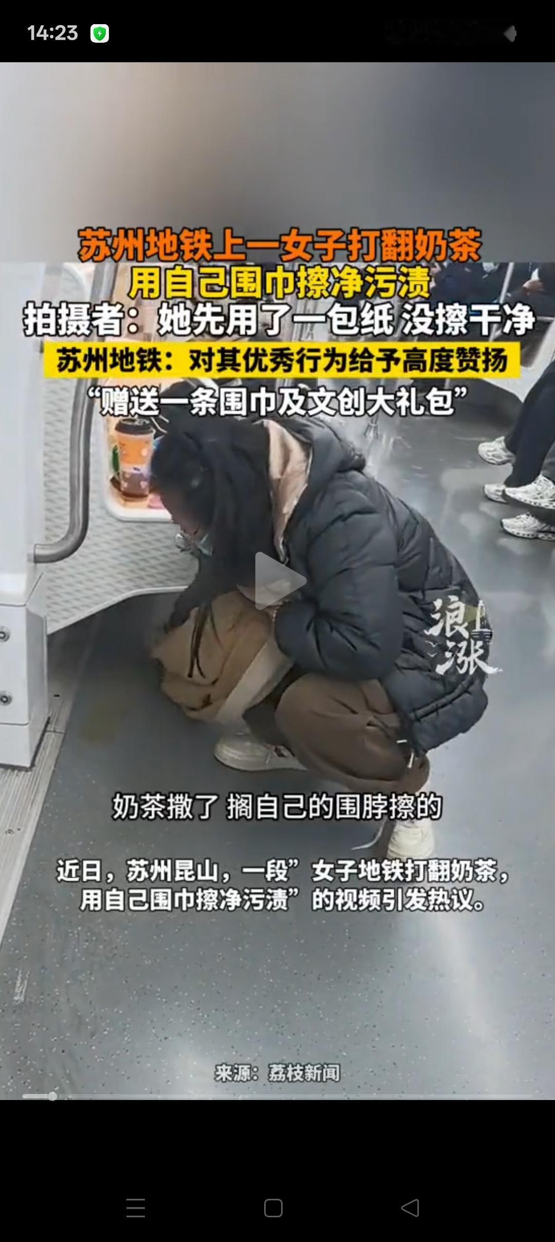 “教养不只是说说而已[玫瑰]”,苏州地铁上,一女孩不小心把奶茶泼到了座位和地板上。不料她的一个举动,却让所有人都竖起了大拇指[赞] 她居然没有一点点犹豫,先是用纸巾小心的擦拭座位,发现根本不够。于是立马取下围巾,仔细的把泼在地铁上的奶茶全部擦干净了,连地板的角角落落也不放过。 临走前,还检查了一遍,才放心离开。看到她擦地的样子,很认真,很美。 目前,苏州地铁正在寻找这位女孩,准备赠送一条新围巾和礼品。 因为她的举动,非常有责任感,大局观,值得所有人学习。一般人可能真的做不到,佩服[赞][赞]