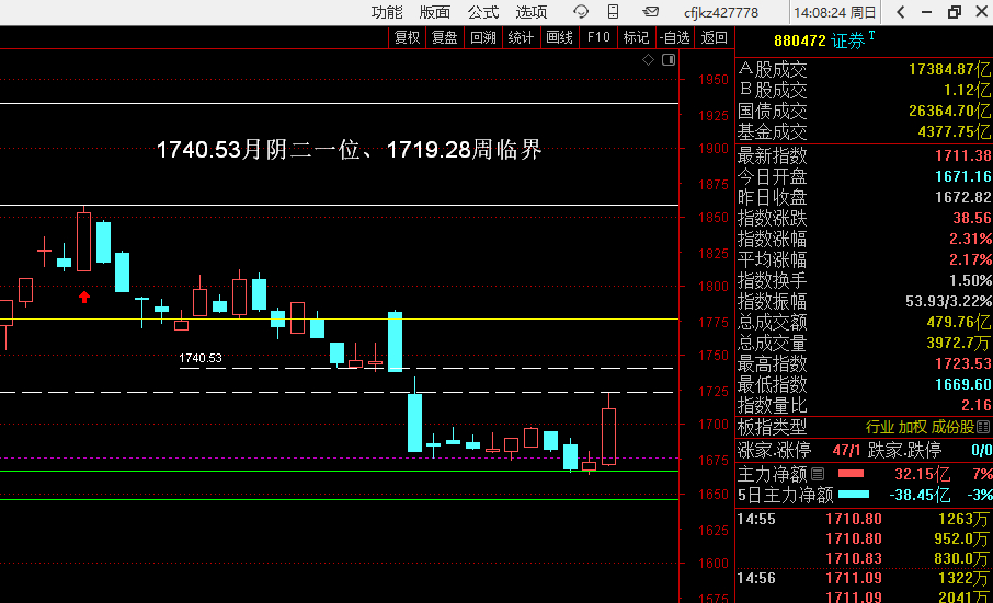 证券指数能够以刹车+换挡,形成量学的准两级建构站稳月大阴的二一位1740.53,一旦出现就不看空了,目前没有形成,周五这里还仅仅只是一个次阳,连刹车都没完整出现,以刹车+换挡站稳月大阴二一位,行业指数(或者上证指数、或者具体个股),其大周期的趋势就正式反转了。这种方法是黑马王子老师在大熊市里面正确操作的保命法宝。