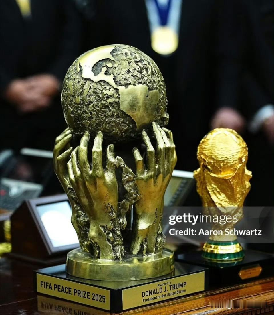 特朗普昨天获得的“国际足联和平奖”就摆放在他的办公桌上。