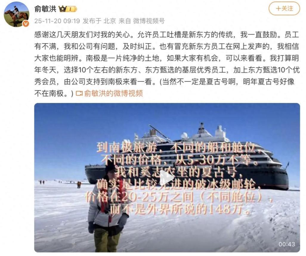俞敏洪回应“员工公开信吐槽”风波,写信的员工不会像网上说的那样会被整,在正常上班!对于员工反映的问题,自己也在找人调查整改。 2025年12月6号,持续升温的新东方公开信争议终于迎来创始人俞敏洪的正面回应。 在社交平台的发声中,他首先打消了公众最关心的顾虑,此前写信吐槽加班问题的员工,均在原岗位正常工作,所谓“被打击报复”的传言并不属实。 俞敏洪直言不讳地承认,自己此前在南极发布的内部信存在表达疏漏,没能体谅到那个时候正身处加班状态的员工们的真实感受。 这份回应暂时平息了外界的猜测,但要理解员工群体的情绪共鸣点,还得从一个月前的南极之行说起。 11月16日,新东方迎来32周年庆,身为创始人的俞敏洪正在南极考察,当天他向全体员工发送了题为“冰雪中的坚守”的内部信函。 信中既有对创业三十年历程的回顾,也有对未来发展的规划,其中特别提到“欢迎大家公开表达看法”,正是这句话,给了后来发声的员工勇气。 11月18日当天,他集中发布了10条现场视频,画面里的南极冰川壮阔无垠,引得不少网友赞叹。面 对评论区的疑问,他解释称因南极信号不稳定,这些视频是四天前拍摄的。 不过网友的关注很快从风景转向行程本身,有网友说自己调查后发现,他乘坐的“夏古号”邮轮,单人次29天行程的报价在旅行平台上高达148万元。 这个数字让内部员工的情绪有了波动,有人私下感慨“我们在办公室熬夜赶进度,老板在南极看风景”,更有极端声音将两者直接关联。 这种情绪的积累,在12月4日达到了顶点,杭州新东方一名课程顾问,选择在公司钉钉全员群发布长文,标题定为《别让教育初心,耗在无序加班里》。 文章里,她详细描述了一线岗位的真实处境,每天工作时长普遍超过10小时,“996单休”已经成为无法打破的惯例,这与劳动合同中明确约定的“双休8小时”严重不符。 除此之外,招生指标定得远超合理范围,加班不仅没有相应报酬,就连工作安排也时常临时变更,让人难以适应。 这位员工在文中提到,自己正是受到俞敏洪南极来信中“鼓励吐槽”的启发才选择发声。但让她始料未及的是,文章发布后不久就被系统删除,自己的钉钉账号也被封禁。 这一结果迅速引发外界关注,网友纷纷前往俞敏洪的视频评论区留言,追问加班问题的解决方案。 事实上,在这次回应之前,俞敏洪已经针对南极行程的争议有过一次致歉。 11月23日,他表示信中使用南极相关的比喻并无炫耀之意,对于“用员工血汗钱旅游”的说法,他认为并不恰当,强调管理层同样在为企业发展努力。 只是那次致歉,并未触及员工最关心的加班权益问题。 直到12月6日的回应,俞敏洪才真正直面了问题的关键。 他坦言,当时身处南极特殊环境,写信时自然融入了当地场景,完全没考虑到这种表述会让正在加班的员工产生心理落差。 这些话点出了整个事件的核心矛盾,管理者的“远方视角”与员工的“现实处境”形成了鲜明反差。 员工们在狭小的出租屋里对着电脑核算数据、对接客户,常常忙到连晚饭都没时间吃。 而俞敏洪在遥远的南极欣赏着极致风光,在视频中透露,计划成立青少年探索中心,明年组织孩子来南极考察。 更让员工感到失望的是,信中承诺的“欢迎吐槽”,在实际发生时却换来“删帖封号”的结果。 员工们真正在意的,从来不是一句简单的道歉,而是自身合法权益能否得到保障。 就像这位员工在信中引用的俞敏洪过往言论:“如果公司持续损害员工权益,就不是好公司。” 公司与员工之间,本质上是相互成就的关系,企业的发展依赖员工的付出,而员工的付出也理应得到尊重和合理回报。 俞敏洪在回应里也提到,已经让相关部门去调查员工反映的问题,真有问题就立刻纠正。 这个承诺能不能兑现,还需要时间检验,但至少让大家看到了正视问题的态度。 再宏大的“教育初心”,再遥远的南极风光,都得建立在眼前员工的权益得到保障的基础上。 要是连身边人的辛苦都顾及不到,再美的远方,也撑不起企业的长久发展。
