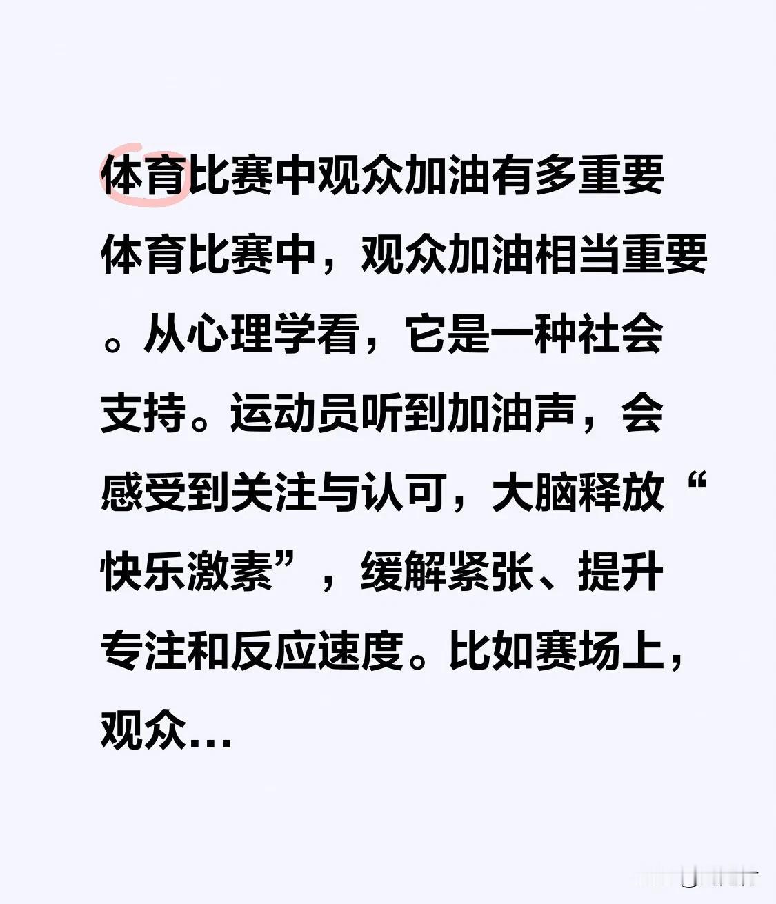 体育比赛中观众加油有多重要 体育比赛中观众加油的重要性 体育比赛中,观众加油至关重要。从心理学角度看,它是一种社会支持。运动员听到加油声,会感受到关注与认可,大脑释放“快乐激素”,缓解紧张情绪,提升专注度与反应速度。例如在赛场上,观众热情呐喊能让运动员更自信。 从生理学角度看,加油声能激活运动员的应激反应机制。高亢的呐喊会使运动员交感神经兴奋,肾上腺素分泌增加,让他们在关键时刻爆发出更强的力量与速度。 不过,加油声也会受其他因素影响。如混团世界杯,因一些事件,观众将加油声都给了中国香港队,日本队获得的现场支持较少。可见,观众加油不仅影响运动员,还反映了社会立场与氛围。 运动员赛场心理 体育情绪 运动竞赛心理 运动员心理支持 运动员光环效应