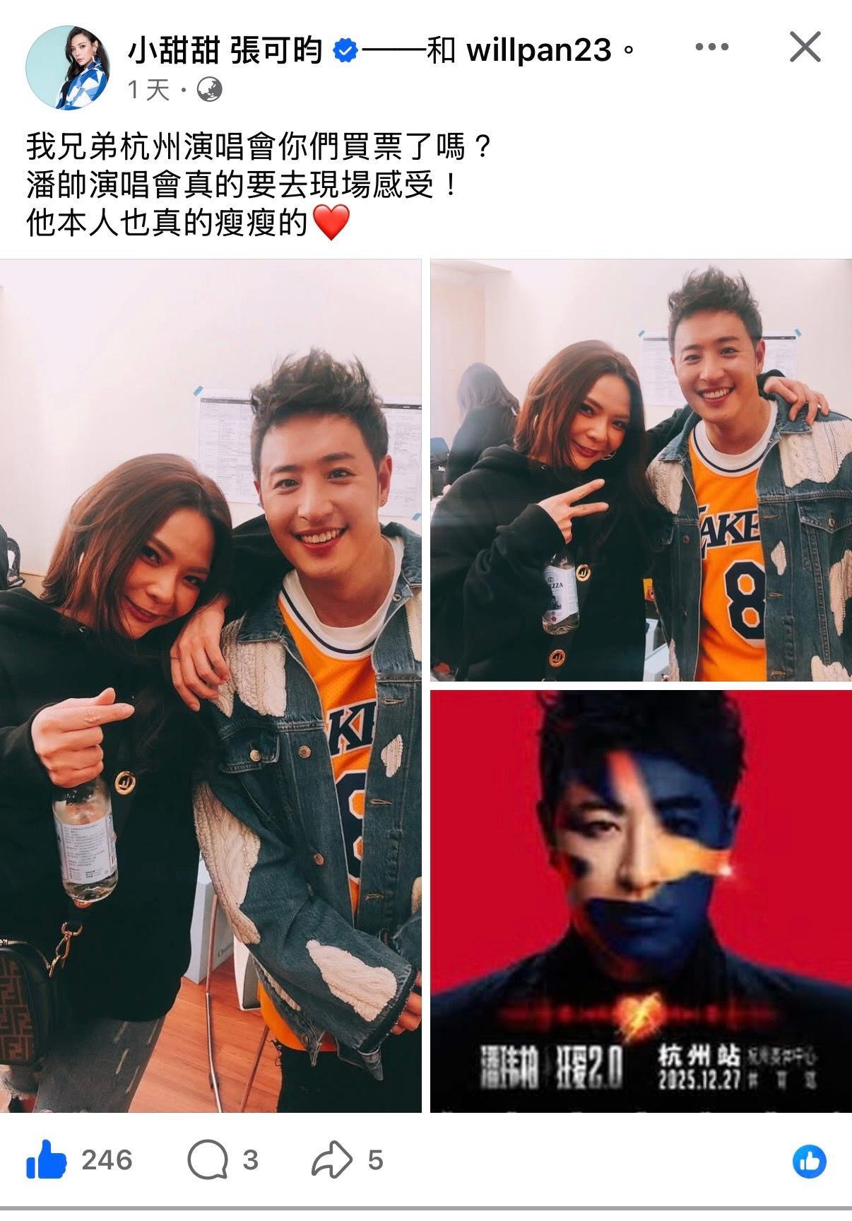 小甜甜發文力挺潘瑋柏杭州演唱會:我兄弟杭州演唱会你们买票了吗?