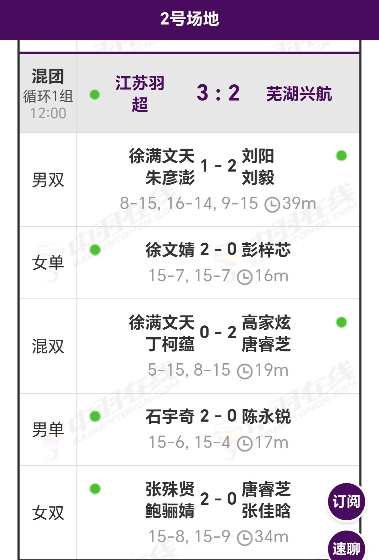 江苏羽超凭借石宇奇和张殊贤/鲍骊婧最后两场胜利,3-2逆转翻盘取胜芜湖兴航 2025年羽超联赛浙江杭州站 江苏羽超对阵芜湖兴航,第四场男单石宇奇出战对阵芜湖兴航的陈永锐,对方也是无人,用一个打男双的小将应战,比赛真是毫无悬念,石宇奇以2 - 0(15-6, 15-4)直落两局仅用时17分钟横扫陈永锐,轻松取胜为江苏羽超扳平比分2-2。 最后一场女双,江苏羽超张殊贤/鲍骊婧出战,对阵唐睿芝/张佳晗,双方实力差距明显,张殊贤/鲍骊婧直落两局以2 - 0(15-8, 15-9)击败唐睿芝/张佳晗,为江苏羽超再取一分,最后以3-2战胜芜湖兴航。