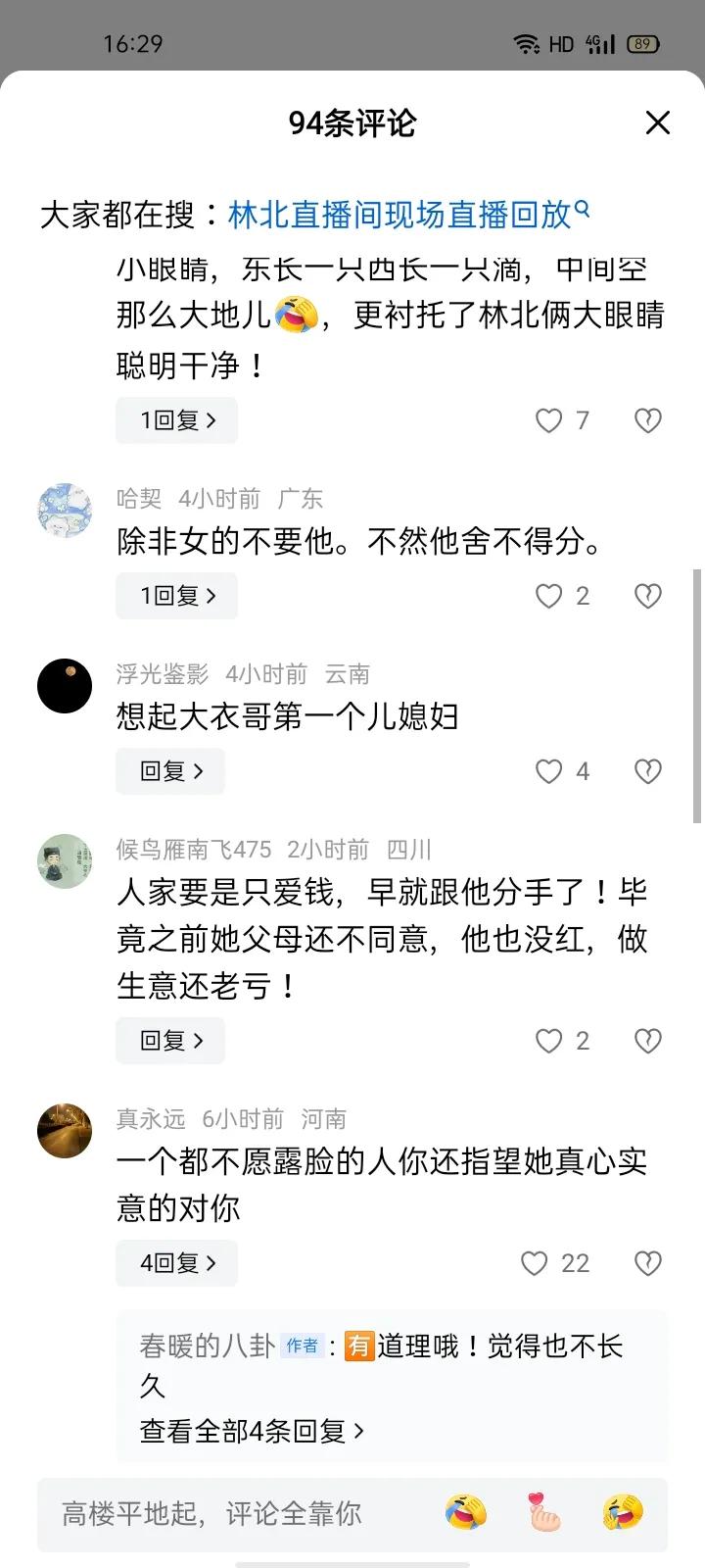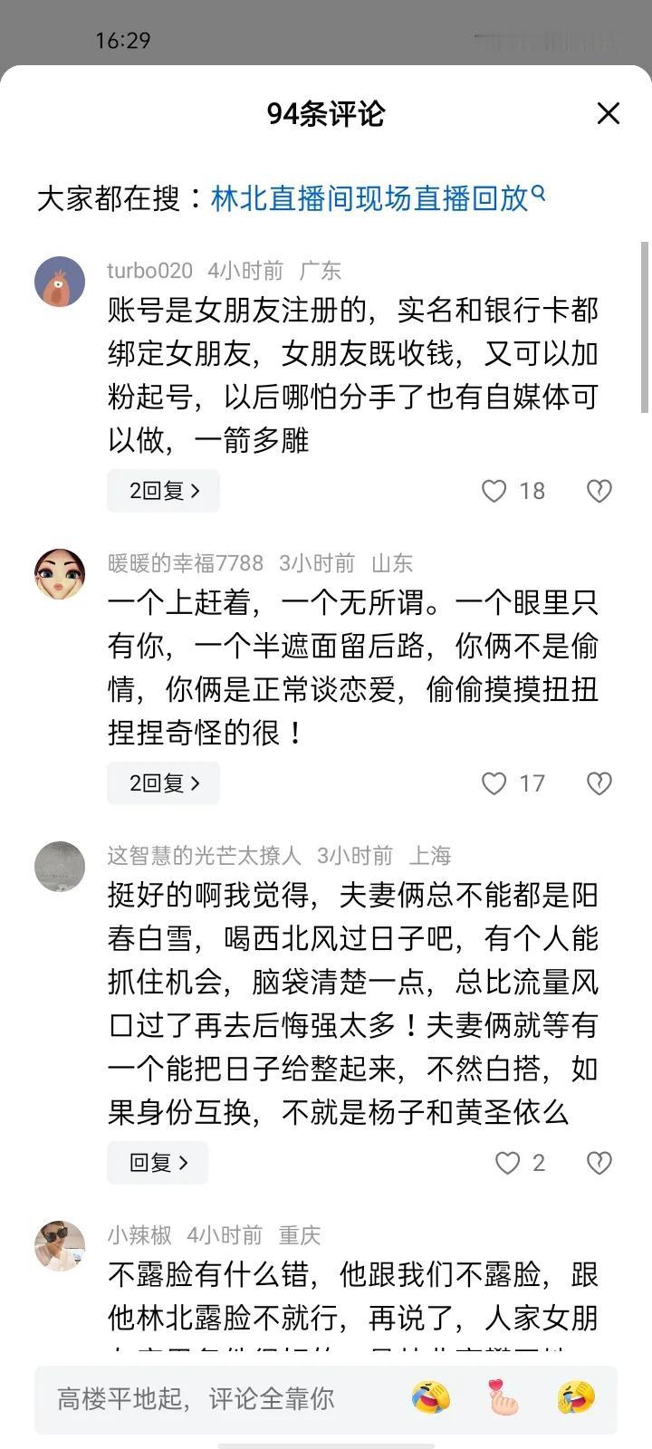 林北女朋友被网暴,不都是因为他! 说女友不摘口罩的!没必要两口子都当网红吧!这部分人小点声。浪催的! 说你朋友收礼物眼睛都亮了的!谁不爱财?有愿意刷的,又不是抢来的!品牌方为了曝光!大咖为了建立连接。小人物,那是为偶像打call,各自都有小心思。 能被刷礼物,那是本事,各凭本事吃饭。女朋友有福气,管别人怎么说。郭德纲说了,挣得这钱里,有一半是挨骂的!说哦多好! 两口子,一个阳春白雪,一个爱财如命。等真有事了,能拿出钱来,比什么都强。 说风凉话的,要么坏,要么蠢!见不得别人好!