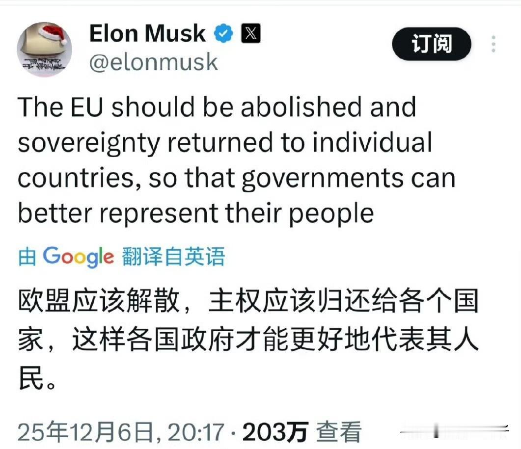 由于X被欧盟罚了1.2亿欧元,马斯克大为不爽,呼吁欧盟解散,把主权归还给各个国家。 马斯克当然不是关心欧洲各国的人民的权力和利益,他关心的是欧盟解散后就都变成小国了,基本没有实力应对X这种庞然大物的企业。 众所周知,欧盟成立的最初目的就是防止欧洲内部再发生战争,弥平各国的仇恨,尤其是德国和法国的仇恨。 对内,通过欧盟把各国的利益绑定在一起,使用共同的货币,让欧盟内部的人员可以自由通行;对外,通过和全球各国谈判,用欧盟的市场争取最大的权益。 欧盟建立的初衷是好的,就是成员国太多了,而且每个国家的权力都一样,很多时候一个小国就能一票否决,导致欧盟很难顺畅的运行。