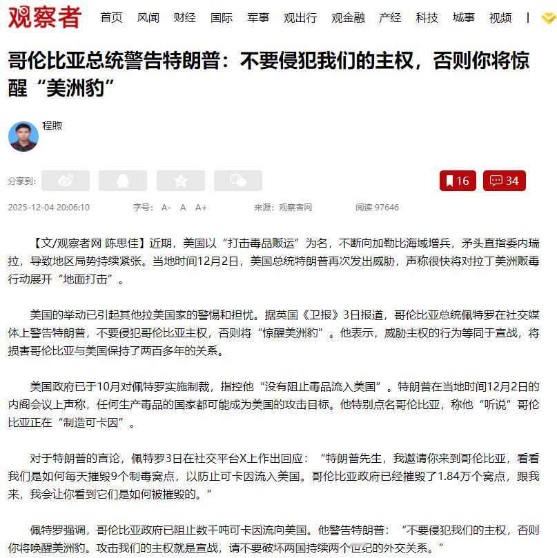 美国摊上大事了!哥伦比亚总统直接在社交媒体向特朗普下“战书”! 据媒体12月4日报道:最近美洲这边气氛特别紧张,特朗普说要派地面部队去拉美打击贩毒,哥伦比亚总统佩特罗直接怼回去:别碰我们的主权,不然就把“美洲豹”吵醒了。 有人可能觉得不就是打贩毒吗?至于这么强硬?其实佩特罗这警告不是吓唬人的,就是因为美国太过分,拉美国家早就对美国的霸道行径实在受不了了,这是明着要护自己的地盘。 咱们先说说美国所谓的“打贩毒”,根本就是借口,真实想法就是想在拉美多驻军、掌控这片地方。 从今年8月开始,美国就往加勒比海派兵,到11月兵力都到冷战后最多了,把最先进的核动力航母、驱逐舰都派来了,兵力超过1.5万人。 这些家伙哪是对付贩毒分子的?天天在委内瑞拉海边转悠,明摆着就是挑衅施压。 更让人不齿的是,美国在这海域的所谓“缉毒”已经搞死了83个人,击沉了20多艘他们说的“贩毒船”。 可美国压根拿不出证据证明这些人是毒贩、船是运毒的,62个国际组织都骂他们乱杀平民,特朗普不管这些,还变本加厉说要搞地面打击,这根本就是借禁毒的名义在拉美耍霸权,随便欺负人家。 正因为看清了这点,佩特罗才敢这么硬气。有人说哥伦比亚是美国的老盟友,怎么敢翻脸? 其实哥伦比亚自己打贩毒已经很卖力了,今年上半年就缴了395吨可卡因,11月还查出了13.8吨,是近十年最多的。 可美国不但不认可,反而在10月骂佩特罗“纵容贩毒”,停了援助还制裁他,这就是干涉人家内政。 佩特罗说“碰主权就是宣战”,一点没夸张,美国想借打毒把军队伸进哥伦比亚,他肯定不答应。 佩特罗说的“美洲豹”,就是拉美国家反抗美国霸权的意思。美洲豹平时不惹事,惹急了很厉害。 现在委内瑞拉已经派了2.5万士兵守边境,还击落过美军的飞行器,加勒比15个国家里有6个直接不配合美国。 有人担心哥伦比亚会被报复,其实佩特罗心里有数,美国现在兵力不够,把其他地方的航母都调过来了,盟友也不支持,根本没能力在拉美搞大事。 说到底,特朗普的霸道做法最后只会坑自己。拉美国家不是软柿子,谁都有权护自己的地盘。 佩特罗已经把话说透了,再逼下去,醒的就不只是哥伦比亚这只“美洲豹”,而是整个拉美反抗美国的力量。 到时候美国在拉美的利益全完了,局势也会乱套。希望特朗普早点认清现实,别真把“美洲豹”惹急了,到时候后悔都来不及。