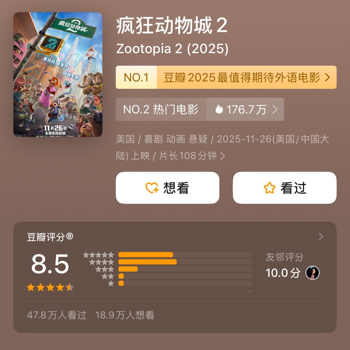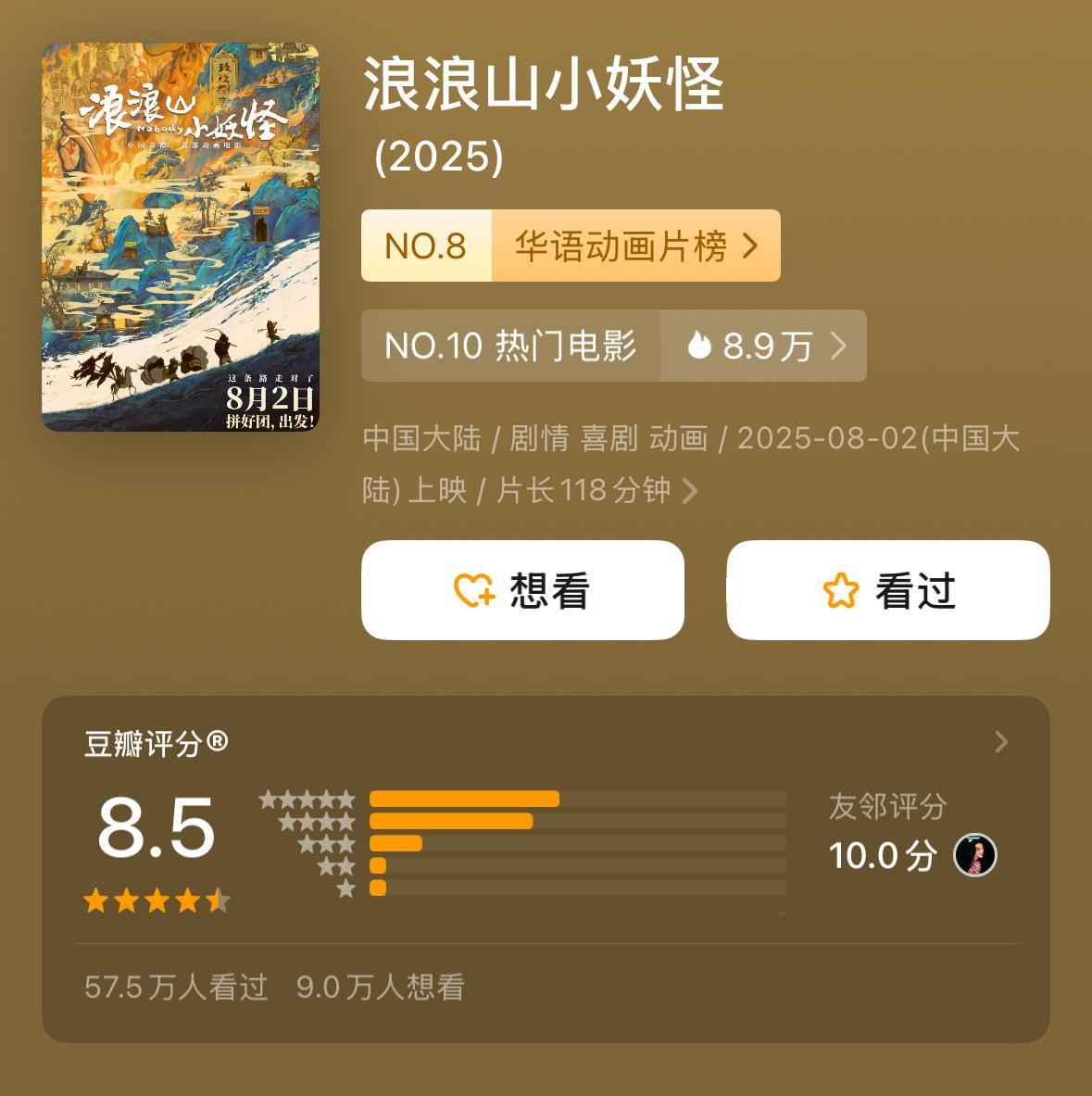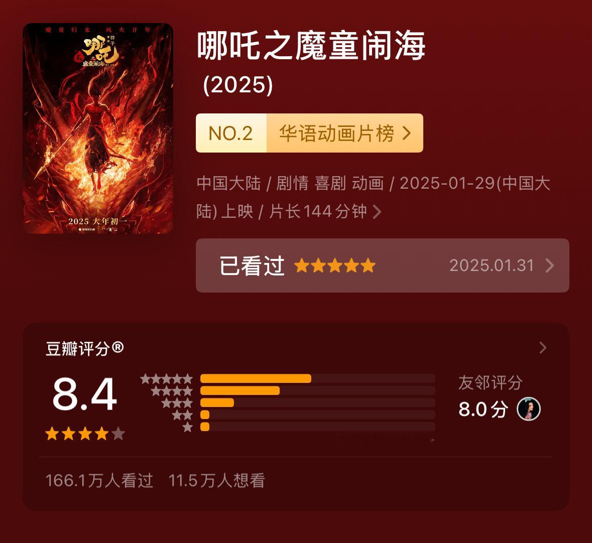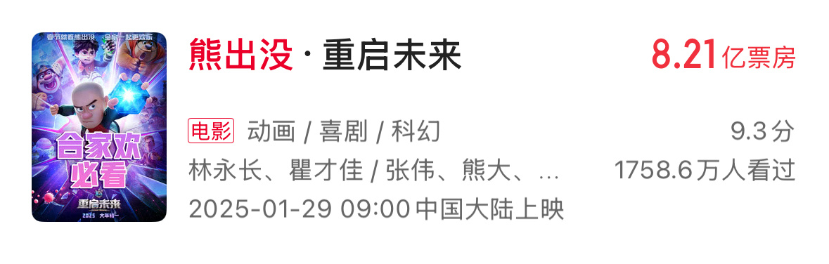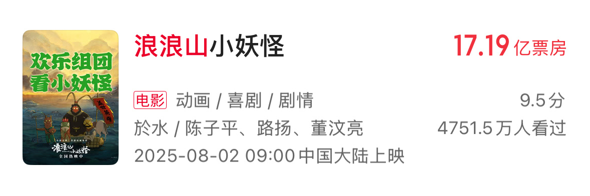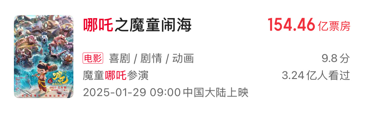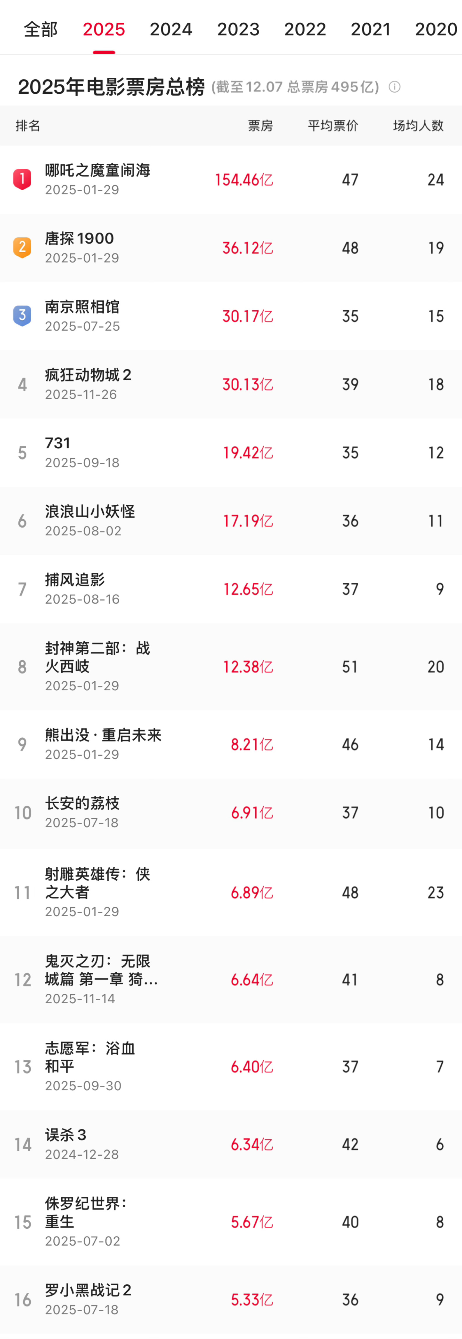 2025票房前16有6部动画电影动画电影:不是市场冷冰冰,只是暖的不是你2025不仅年度top1是哪吒2,前16里还有6部动画电影(对比2024,前20只有两部动画电影)《哪吒之魔童闹海》评分8.4,票房154.46亿《疯狂动物城2》评分8.5,票房30亿(上映12天)《浪浪山小妖怪》评分8.5,票房17.19亿《熊出没重启未来》评分7.1,票房8.21亿《鬼灭之刃无限城篇》评分8.5,票房6.28亿《罗小黑战记2》评分8.7,票房5.33亿动画电影 不是市场冷冰冰