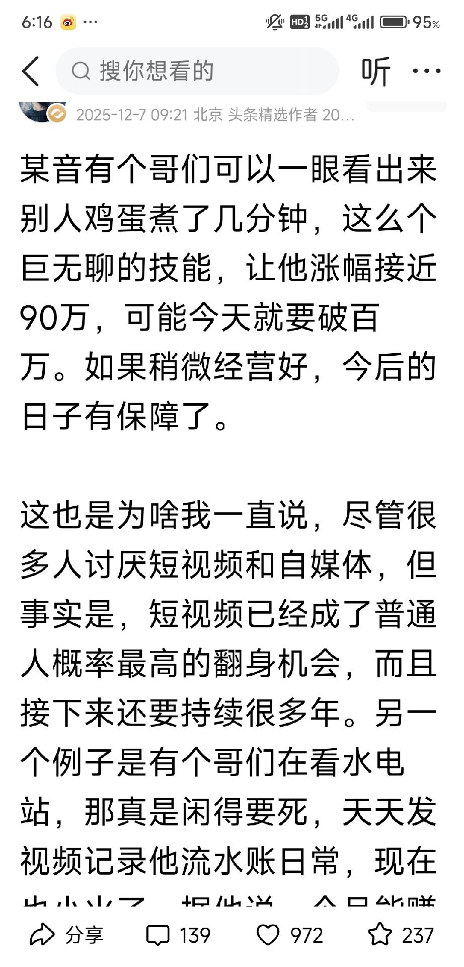 一段通透的话曾仕强老先生说“你要记住我这句话,你会活得很好,轻轻松松过日子,别活的太累。该是你的跑不掉。不要自找麻烦,你说忙,要养成习惯才好,那个下辈子还忙,要忙到哪一辈子,不知道你这一辈子该有多少钱,他就会有多。你想也是那么多钱,你不想还是那么多钱,你做也是那么多,你不做还是自然来,你自己去想。”。 看了九边的这篇关于自媒体的文章我悟了: 大大方方的展示自己平淡如水,过腻了的生活。有人可以通过看出别人的鸡蛋煮了几分钟火有人可以通过看水电站火。自己怎么就不学学呢。 说文解字里说:忙,心亡你才会忙 追求外物,只会内耗自己的有限心力到枯竭。 曾老也说了过好自己的生活,该是自个的跑不掉。 舒舒服服,过辛苦日子; 辛辛苦苦,过舒服日子。 追求不定的外物会短暂的快乐,却会让自己越来越麻木。 追求恒定的内在,虽苦却生生不息 命运也是如此 万物也是这个理。