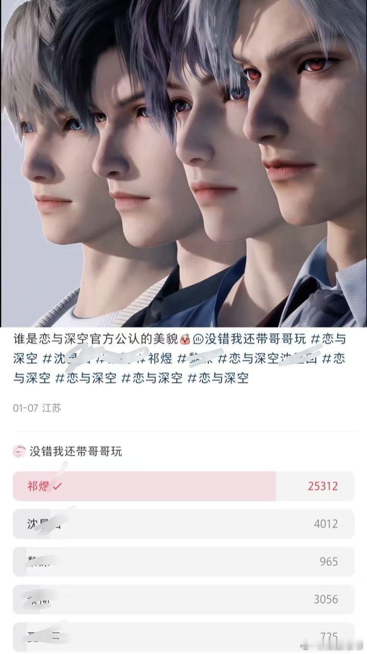 又到了固定NPC刷新环节不好意思看板郎就是看板郎啊,是会跟恋与深空一起出现在各大平台各大社交软件各个榜单上,是每次登顶就像祁煜一个人登顶,是提到恋与深空就会想到紫毛帅气看板郎,是祁煜跟恋与深空绑定最深。花三十元你只能假装买个舒心,只有出现在各大平台的看板郎是实打实的