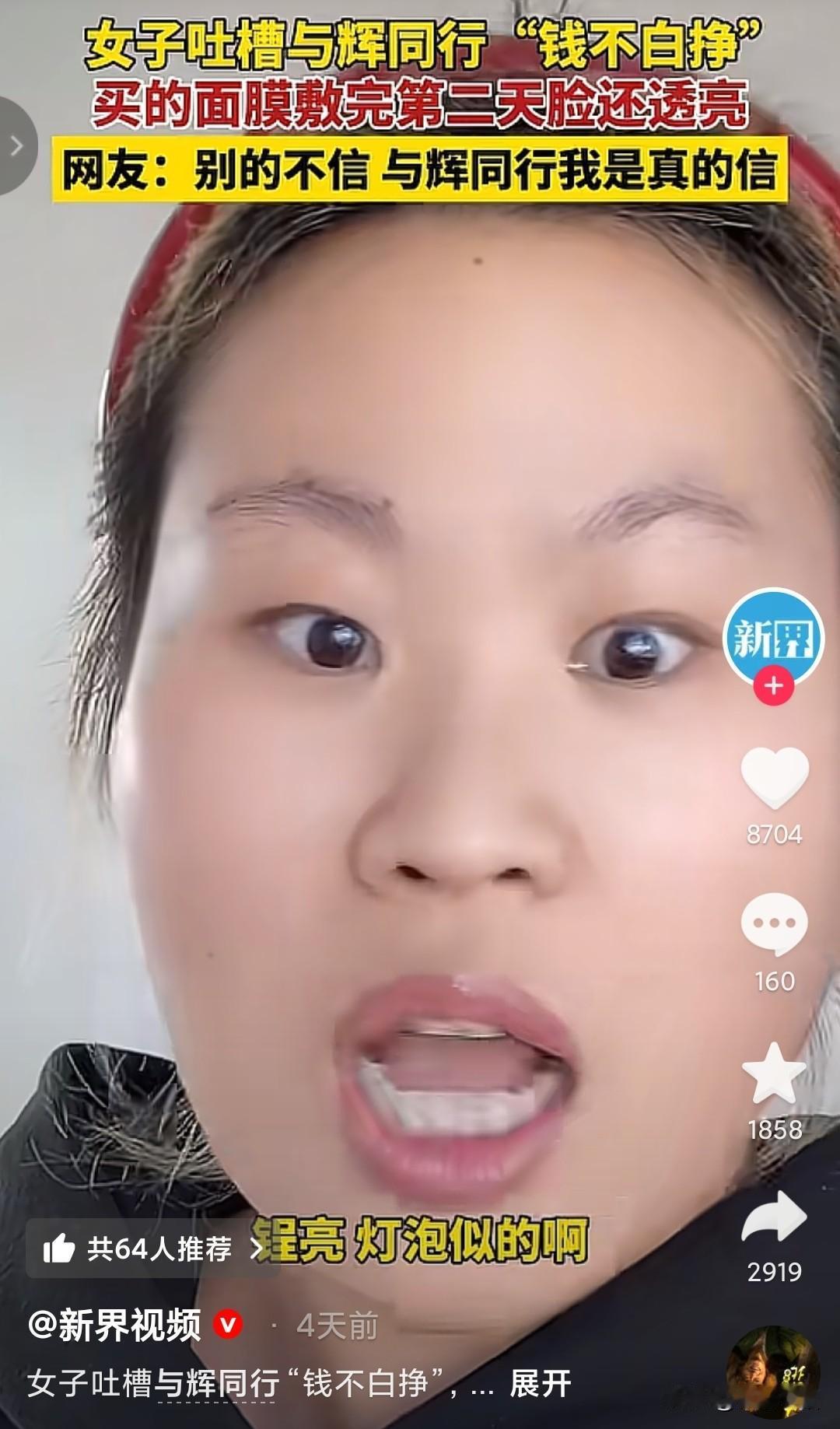 现在都在说面膜只能作为补水,根本不具有美白、祛斑等其他效果,但与辉同行卖的面膜却备受夸赞。 据反馈的人说用完之后非常的亮,售价每片只要三元,买回来一共用了5片,脸锃亮的。 有钱买不如会选,其实面膜不能美白祛斑的原因就是它里面的精华含量太少,大部分都是增稠剂,而且有很多精华液是不能够渗透进真皮层,像超低分子玻尿酸就可以作用到真皮层,可以补水修复,但含量微量的话效果就不明显,所以买的时候一定要看一下成分表。