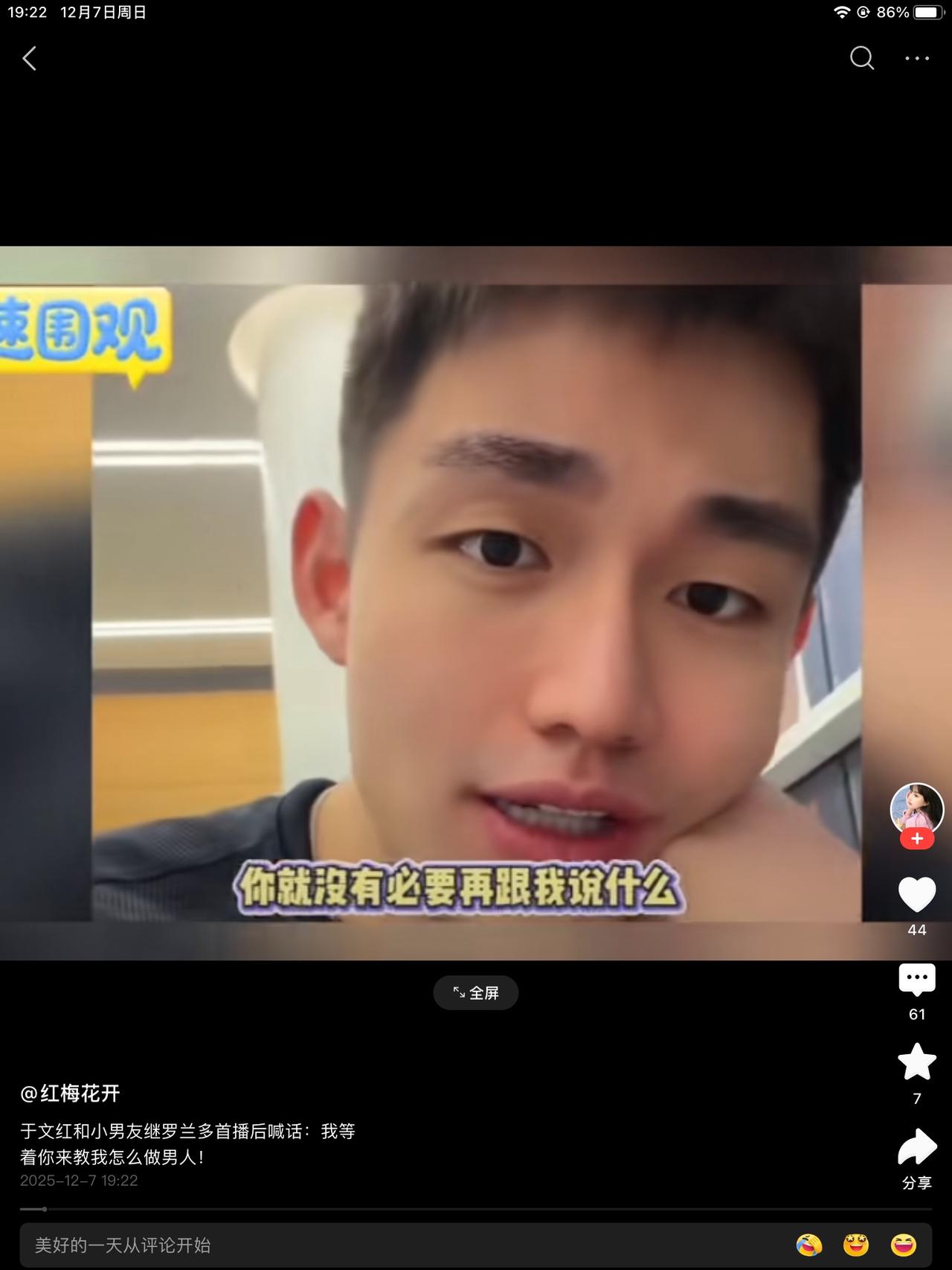 于文红的小男友,小任任。喝粥喝的很嗨皮!我没有意见!当我知道他,曾经是一名军人的时候,我绷不住咯! 你跟我说说气节哪去了!家里不算条件差,爹妈是做调料生意的。能供起在上海上大学。条件可以了! 愿意搭配于文红富婆天天演戏,做项目,拉人做项目,就是销售!这个认知,真不是一般人啊!曾经磨练的钢铁意志,用在这了!还真是无以反驳! 怎么了,有错吗?豪车,手表,一吻可得!名牌衣服,时尚场所,天南海北,玩的见的都不能同日而语!你告诉我!错哪了?我不知道了!只是,很莫名其妙!我跟自己打起来了!还不轻,见血了!