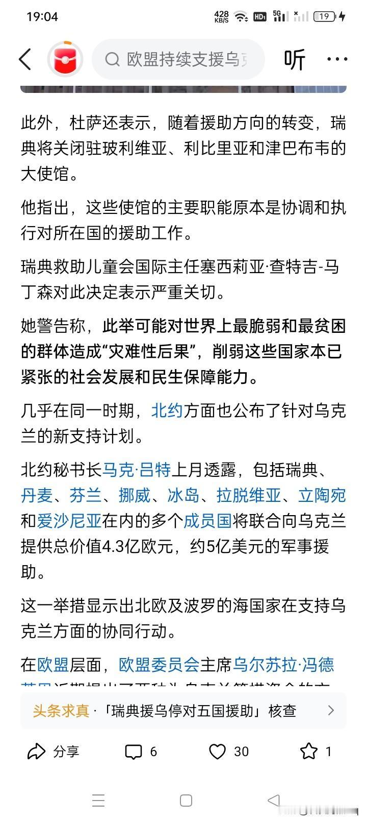 城门失火,殃及池鱼! 瑞典不久前宣布,将停止向津巴布韦,莫桑比克、坦桑尼亚、利比里亚和玻利维亚提供的援助,并且把节省下的资金转向援助给乌克兰。与此同时,也将关闭驻津巴布韦、玻利维亚和利比里亚的大使馆,因为上述大使馆的作用主要就是为了服务瑞典的援助项目。 非洲国家和乌克兰的战争与瑞典的国家安全影响等问题相比,估计根本就没有可比性,不值一提,不足挂齿,甚至好像非洲国家的问题,与瑞典就不存在任何直接的关系。这说明,瑞典虽然是欧洲最积极支持和援助乌克兰的国家之一,但并没有因为乌克兰而对国家造成什么影响和后果,更谈不上什么严重影响和后果,直到现在,也不过取消对非洲几个贫穷国家的援助,将资金转向援助乌克兰。而且,这个决定到2026年的8月1日才正式实施。 这种情况事实上说明,欧洲国家对乌克兰的援助的潜力还有很大,只要他们愿意,对乌克兰的援助,似乎就应该不是个问题。