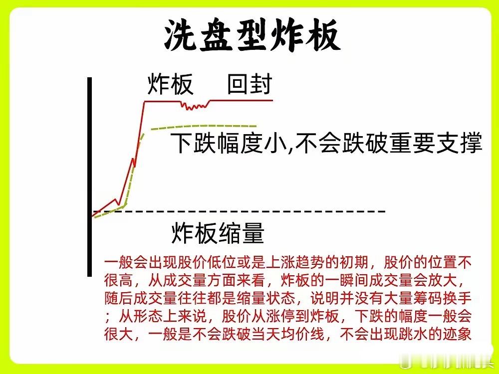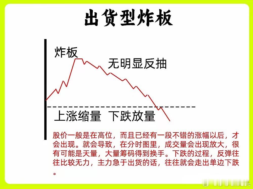 一旦出现个股涨停炸板,你是走还是会留呢!个股出现炸板,往往都是会主力洗盘或是在出货,但是很多分不清他们背后的逻辑。涨停炸板那说明出现了分歧,而重要在于是主力还是散户。如果你还不知道怎么分辨,这期内容就一定要认真看完一、洗盘型炸板主力的核心逻辑就是,股价通过涨停早期涨停以后,出现炸板回落,让哪些不坚定筹码,以为股价会继续下跌,交出筹码,筹码得到换手的一个心理。这种洗盘手法,一般会出现股价低位或是上涨趋势的初期,股价的位置不很高,从成交量方面来看,炸板的一瞬间成交量会放大,随后成交量往往都是缩量状态,说明并没有大量筹码换手;从形态上来说,股价从涨停到炸板,下跌的幅度一般会很大,一般是不会跌破当天均价线,或是是一些重要的支撑位,下跌的幅度很小,不会出现跳水的迹象。等到主力洗盘完毕以后,可能就会继续封板二、出货型炸板主力的逻辑,是让市场热情高涨,自己好偷偷出货的一个过程。所以股价一般是在高位,而且已经有一段不错的涨幅以后,才会出现。就会导致,在分时图里,成交量会出现放大,很有可能是天量,大量筹码得到换手。下跌的过程,反弹往往比较无力,主力急于出货的话,往往就会走出单边下跌。这是从成交量和形态的上区别,股价涨停的时候,在盘口位置,往往封单量很小,说明多方力量其实是不强的。好了!以上就是涨停板出现炸板回落时候,到底是主力洗盘还是主力出货的几种表现。下方我准备了两个案例图,建议牢记起来。希望对大家有启发和帮助,也是最为基础的内容,一定吃透。