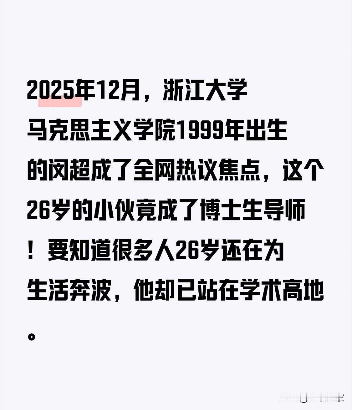2025年12月,浙江大学马克思主义学院1999年出生的闵超成了全网热议焦点,这个26岁的小伙竟成了博士生导师!要知道很多人26岁还在为生活奔波,他却已站在学术高地。 短短两年,他以独立或第一作者身份在核心期刊发表多篇论文,参与3项国家社科基金项目,还拿了不少荣誉。12月刚获浙大人文社科研究优秀成果一等奖的论文,更是深入马克思主义理论前沿。 他开挂式成长离不开浙大“新百人计划”,该计划2020年启动,为青年才俊提供了舞台。不禁让人好奇,未来他还会带来怎样的学术惊喜?大家怎么看这位年轻博导的成就呢? 浙大博导 高校博导 大学博导 浙江博导猝死 青年博导 化学专业博导 欧洲博导 浙大博导 浙大博士 浙江博士 浙江博士后 浙大研究生 经济学博士生 浙师大徐曙