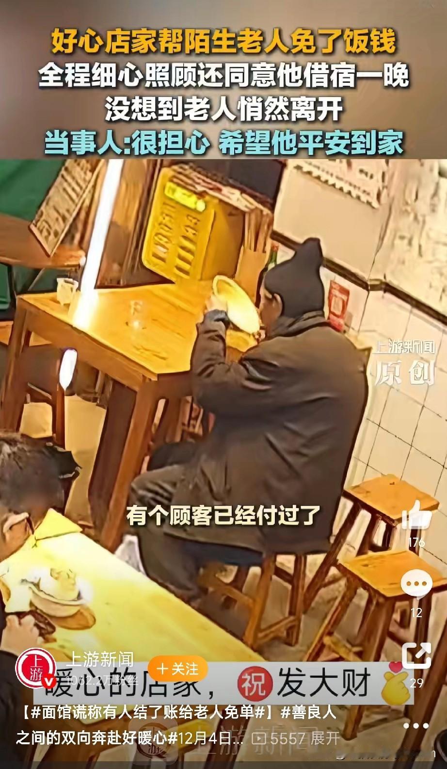 善良的“谎言”真美! 12月的重庆,一家寻常面馆里,发生了不寻常的一幕。 一位老爷爷在门口踌躇张望,店长如常招呼:“小面7元一碗。”老人走进来,压低声音问:“能不能…5块钱吃一碗?” 店长没有半点迟疑,立刻将老人迎进门,还特意向后厨叮嘱:“面煮软一点,多煮一点。” 更暖心的是,店长随后告诉老人:“刚才有位客人,已经帮您付过钱了。” 一碗热面下肚,老人又问起末班车。得知车已错过,他竟想在这小小面馆借宿一晚。就在店长转身想办法安排时,老人默默离开了,没再添任何麻烦。 这个故事,看得人眼眶发热。 这是一个关于尊严与善意的“双向奔赴”。 老人开口求“优惠”, 是生活不易下的无奈; 店长立刻答应,是骨子里的淳朴良善。 而那句“有人帮你结过了”,更是一个无比温柔的谎言——它小心翼翼地把帮助包装成“幸运”,护全了老人敏感的自尊。 这哪是一碗面的施舍? 这分明是两颗干净的心,在寒冬里互相照亮。 店长守护了老人的体面,而老人最后的默默离开,何尝不是一种不忍打扰的善良? 最高级的善良,不仅是伸出手,更是弯下腰,用对方感到舒服的方式,给他温暖。 这碗“免费”的面,值得我们所有人品味! (文章素材来自上游新闻,侵删)