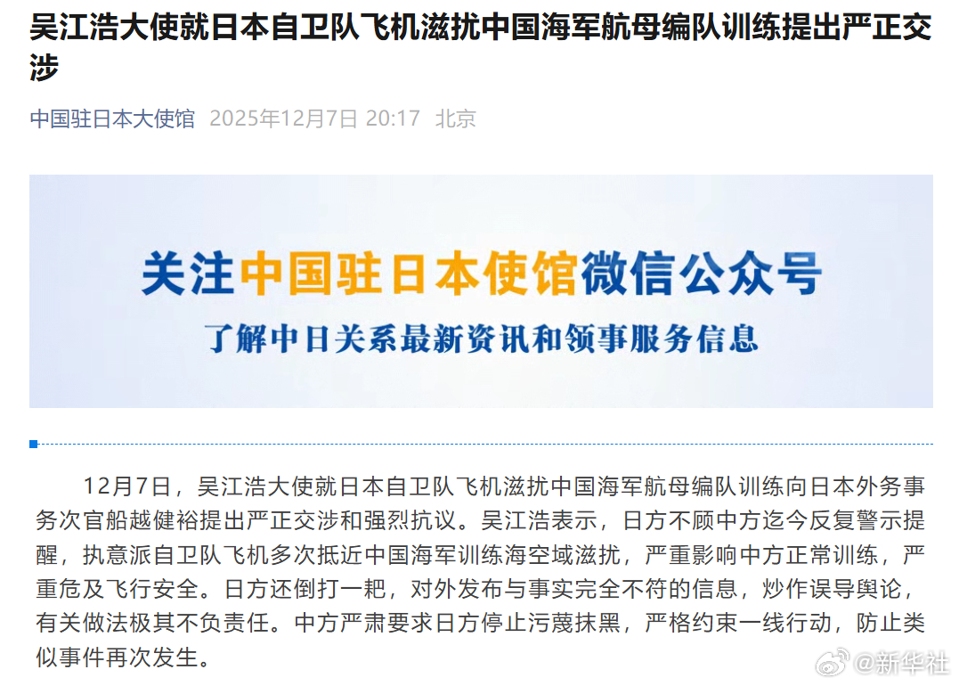 #我驻日大使提出严正交涉强烈抗议#【吴江浩大使就日本自卫队飞机滋扰中国海军航母编队训练提出严正交涉】12月7日,吴江浩大使就日本自卫队飞机滋扰中国海军航母编队训练向日本外务事务次官船越健裕提出严正交涉和强烈抗议。吴江浩表示,日方不顾中方迄今反复警示提醒,执意派自卫队飞机多次抵近中国海军训练海空域滋扰,严重影响中方正常训练,严重危及飞行安全。日方还倒打一耙,对外发布与事实完全不符的信息,炒作误导舆论,有关做法极其不负责任。中方严肃要求日方停止污蔑抹黑,严格约束一线行动,防止类似事件再次发生。#我驻日大使提出严正交涉#(中国驻日本大使馆微信公众号)
