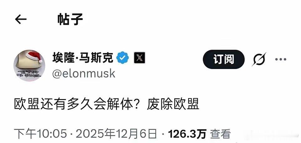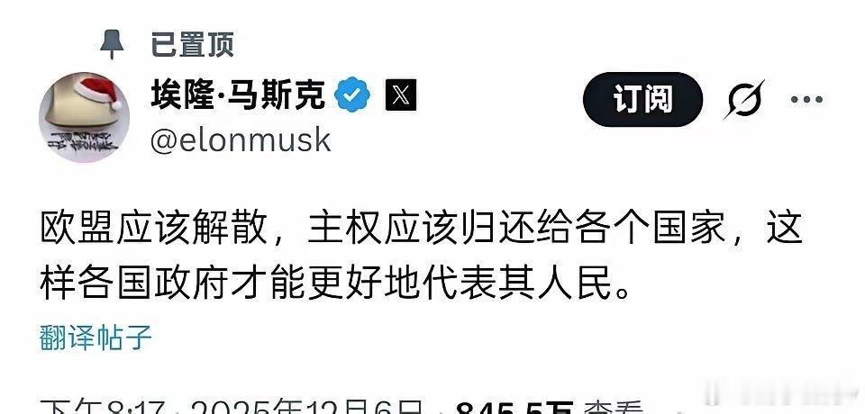 马斯克公开呼吁解散欧盟!马斯克表示: “欧盟应该解散,主权应该归还给各个国家,这样各国政府才能更好地代表其人民。”