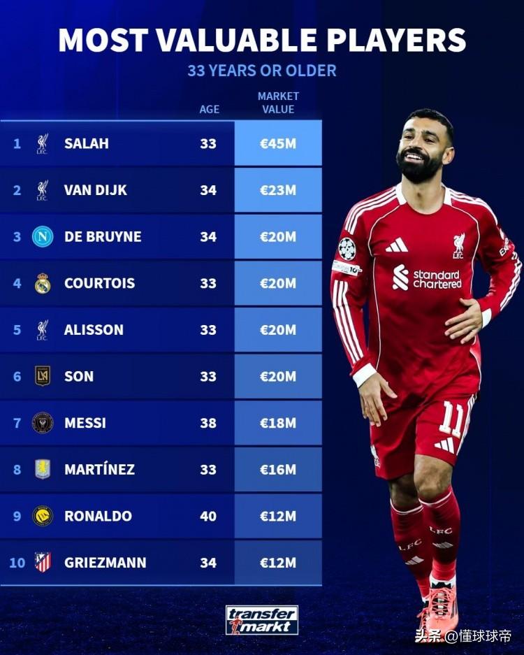 瘦死的骆驼比马大,萨拉赫的身价依然是33岁以上第一人! 虽然萨拉赫的采访发言和利物浦以及主教练斯洛特彻底闹翻了,但是萨拉赫的实力却毋容置疑,在《德国转会市场》统计的目前足坛33岁及以上球员最新身价排行榜上,萨拉赫以4500万欧元排名第一。 因此萨拉赫才有底气和利物浦闹翻,萨拉赫为利物浦的复兴付出了一切,是利物浦对不起自己在先,萨拉赫可以说无愧于心了。 作为阿拉伯世界的球王,萨拉赫不缺下家,沙特的土豪球队排着队等着萨拉赫加盟呢,因此与其在利物浦受气,还不如潇洒离开,去沙特挣大钱当球王呢。 作为对比,33岁的梅西和C罗身价都曾经高达1亿,33岁的萨拉赫和梅罗比起来还是差的有点远了。