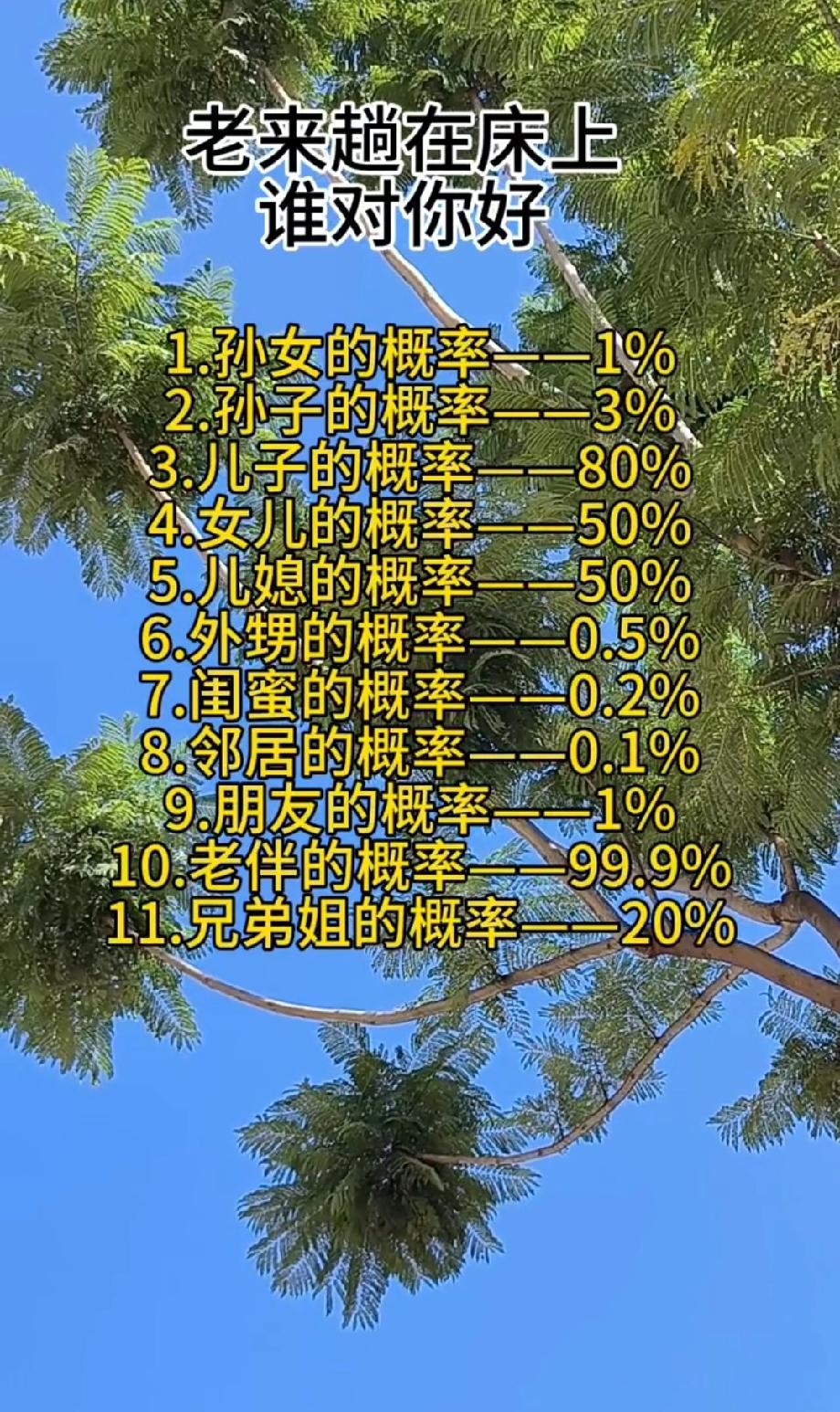 老来趟床上谁对你好?老伴99.9%排第一,儿子80%,孙子仅3%,你认同吗
