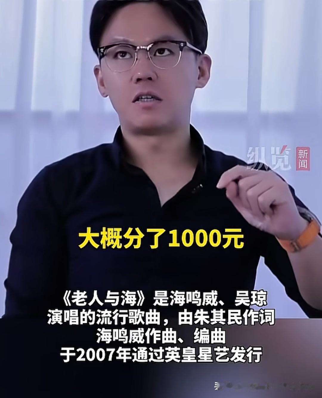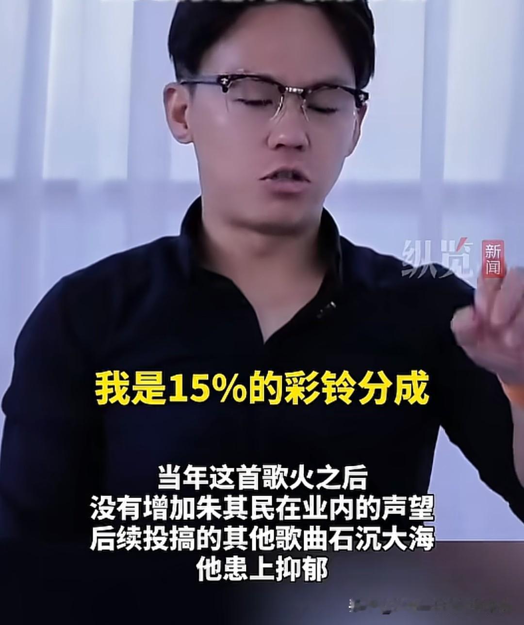 朱其民网红歌曲《老人与海》作词之后,竟然抑郁了!不是因为压力大,走上了人生巅峰,而是功不成,财不获(此处更侧重财少与付出不成正比)、名未起。歌曲的爆火,理论上朱其民以及海鸣威都能大赚一笔,结果两人只挣到了几千块钱,跟别的火出圈的歌手比相差甚远。 其实吧,在彩铃业务兴起的那个年代,整个产业链的收益分配模式对创作者是很不利的。因为运营商、内容提供商、唱片公司等多个环节都参与了分成,而创作者处于产业链的较末端,因此能够获得的分成比例相对较低。总的来讲,就是干活最多、拿的最少,对任何一个打工人而言,多多少少都会抑郁吧!
