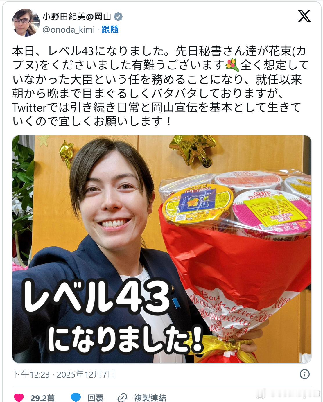 【小野田纪美女迎43岁生日 开心晒“通关FGO关卡” 日网炸裂热议】海外新鲜事日本 日本经济安全保障担当大臣小野田纪美自上任以来,多次在记者会上以清晰简练、逻辑严谨的回答方式应对媒体,被视为政坛少见的直率新星。她也乐于在社交平台分享个人兴趣,以自然、不做作的形象在年轻世代间人气颇高。今天(7日)迎来43岁生日的小野田纪美,更兴奋发文宣布自己成功通关知名手游《FGO》关卡,引发日本网络热烈讨论。综合日媒报道,小野田纪美1982年出生于美国,父亲为美国人,母亲为日本人,1岁随家人回到日本冈山定居,毕业于拓殖大学政经学部政治学科。进入政坛前,她曾当过模特、杂志编辑,甚至在游戏开发公司工作。平常在社交账号上也毫不避讳分享自己热爱ACG(动画、漫画、游戏)及 BL 作品的喜好,因此被网友称为“政坛宅女”“政坛腐女”。今日凌晨(日本时间0点13分),小野田纪美发文庆祝自己43岁生日,同时分享她熬夜奋战后,成功通关《FGO》日服的“奏章IV 人类裁决法庭 トリニティ・メタトロニオス”关卡,并顺利获得1000颗圣晶石奖励。她也向给予攻略建议的玩家们(FGO中对玩家的称呼为“御主”)表达感谢。贴文发布后,日本网友瞬间炸锅。大量留言惊呼她竟然也是“迦勒底御主”,也对一位日本内阁大臣公开表示自己会熬夜打游戏感到十分新奇:“好肝!”“国家安全(确信)!”“接下来可以挑战戴冠战了!”“没想到大臣也玩手游,太亲切了!”“一起为最終章加油吧!”“《FGO》好玩到让大臣牺牲睡眠,还特地发文向全国报告,笑死。”据日媒介绍,小野田纪美大约在2017年9月开始接触《FGO》,起因是想在上下班通勤途中试试这款关注已久的手游,结果一路沉迷至今。她曾在2022年发文提到,游戏中有角色原型来自古代日本邪马台国女王“卑弥呼”,而卑弥呼正是激发她在小学时期立志从政的关键人物,因此她立刻“全力氪金”,把该角色抽到满级。除了分享《FGO》的通关进度外,小野田纪美当天还发布另一篇生日感言:“今天,我升级到43级。前几天秘书们送了我一束花(杯面花束),真的很感谢大家。我从没想过自己会担任大臣,自从上任后每天都忙得不可开交,但我会继续像以往一样,在X平台分享生活点滴,并持续推广冈山,请大家多多指教!”图:日本经济安全保障担当大臣小野田纪美,在今(7)日开心迎接自己的43岁生日。 (图撷取自社群平台「X」)