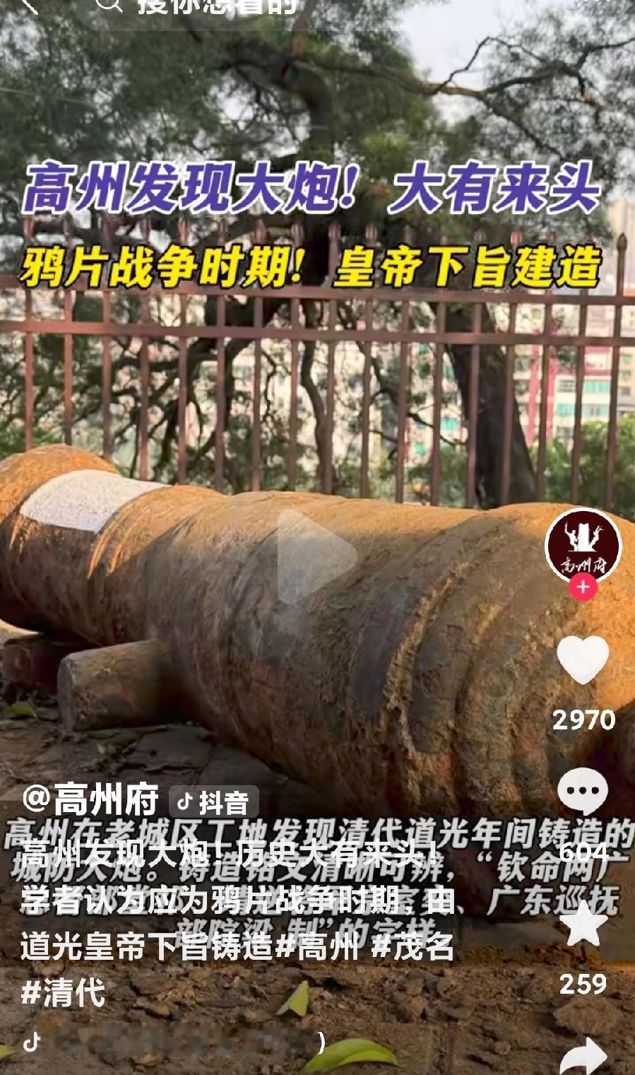 你们整天说我们茂名是“大炮茂”,高州是“大炮高”。这次咱高州可真不是吹牛的,高州是真有大炮了。近日,在高州某工地施工现场,工人挖出了一门大炮。有着千年历史的高州府,再度进入全国网友的视野。古代的高州府,在广东乃至全国都小有名气,毕竟它曾是广东西南部的政治、文化和经济中心。