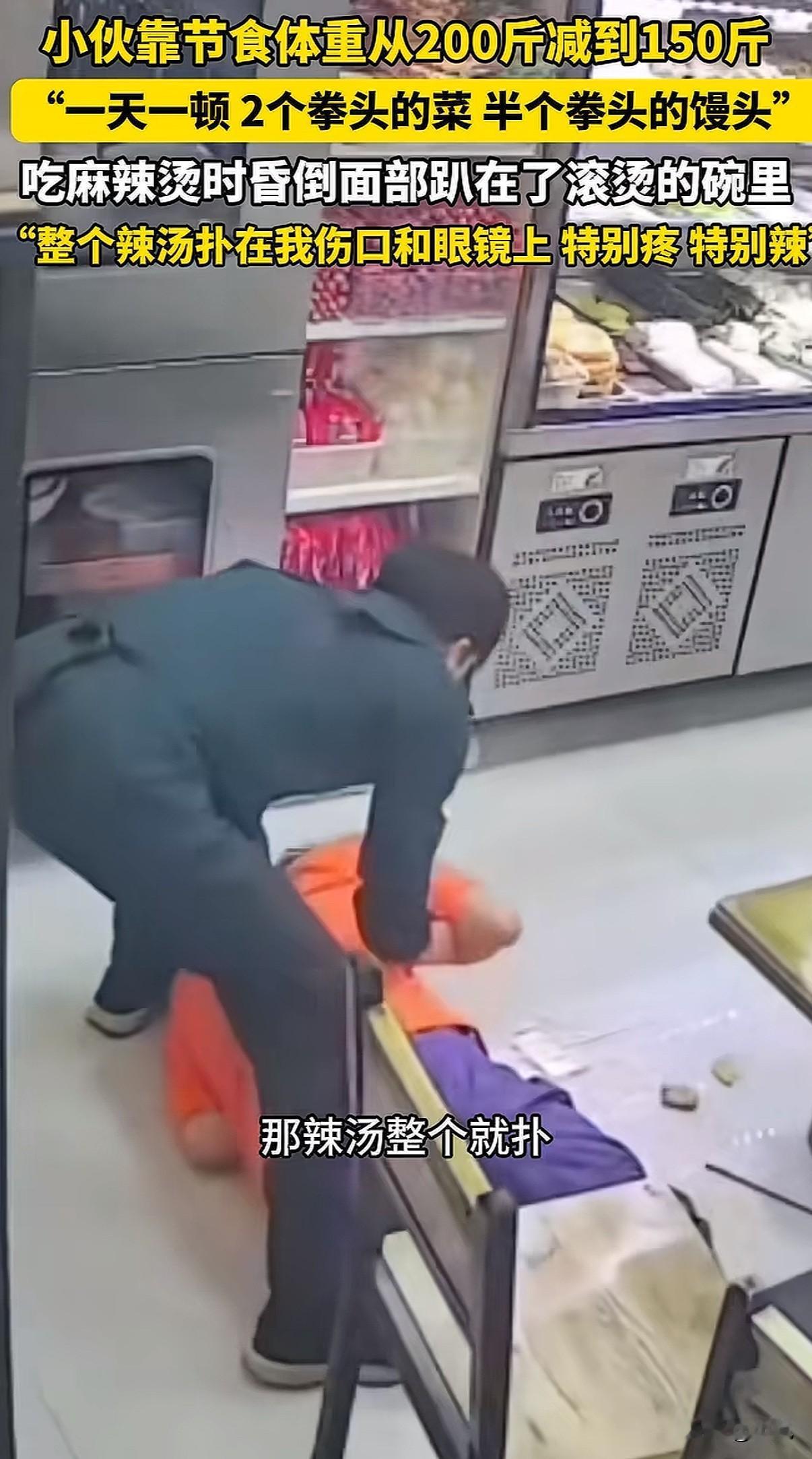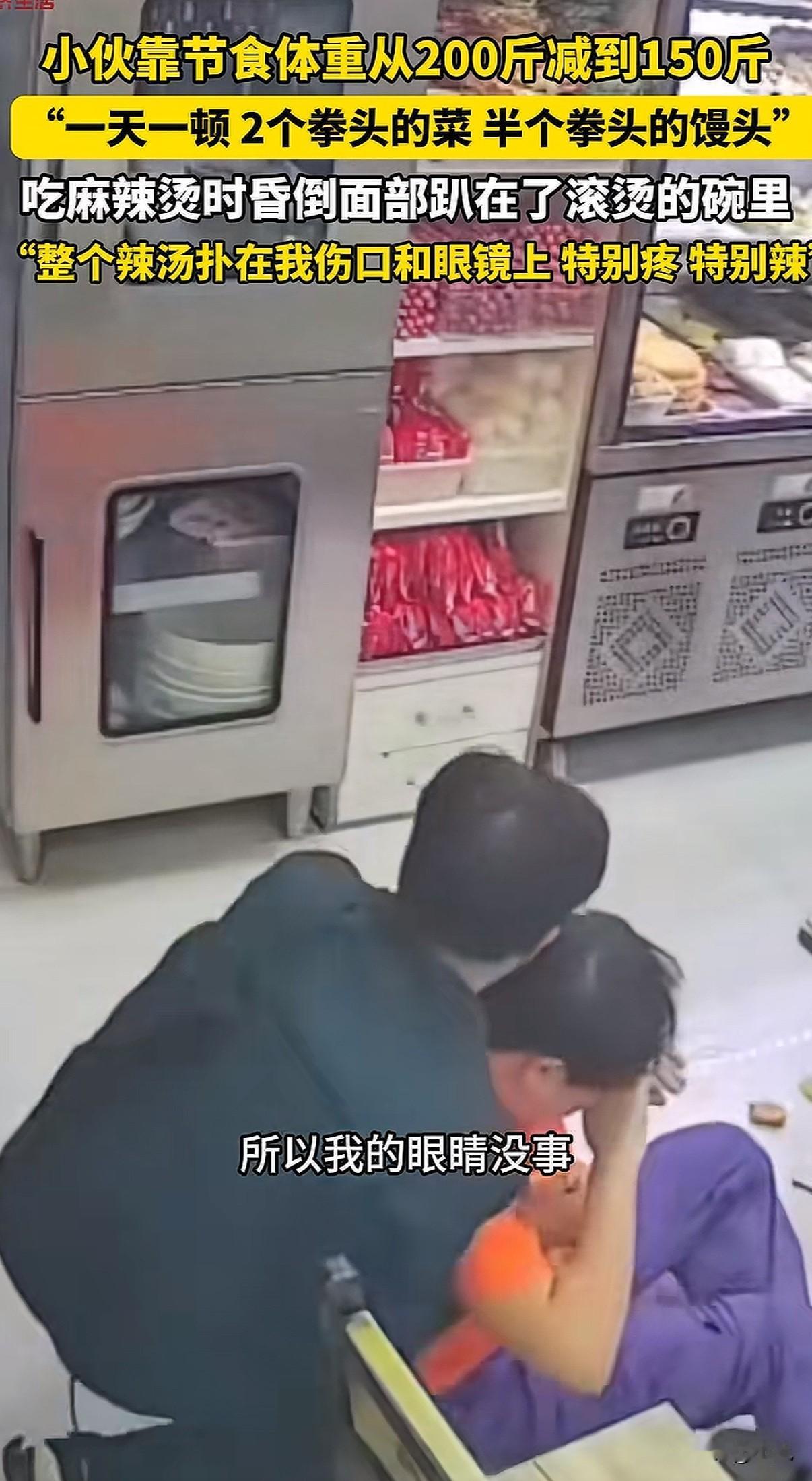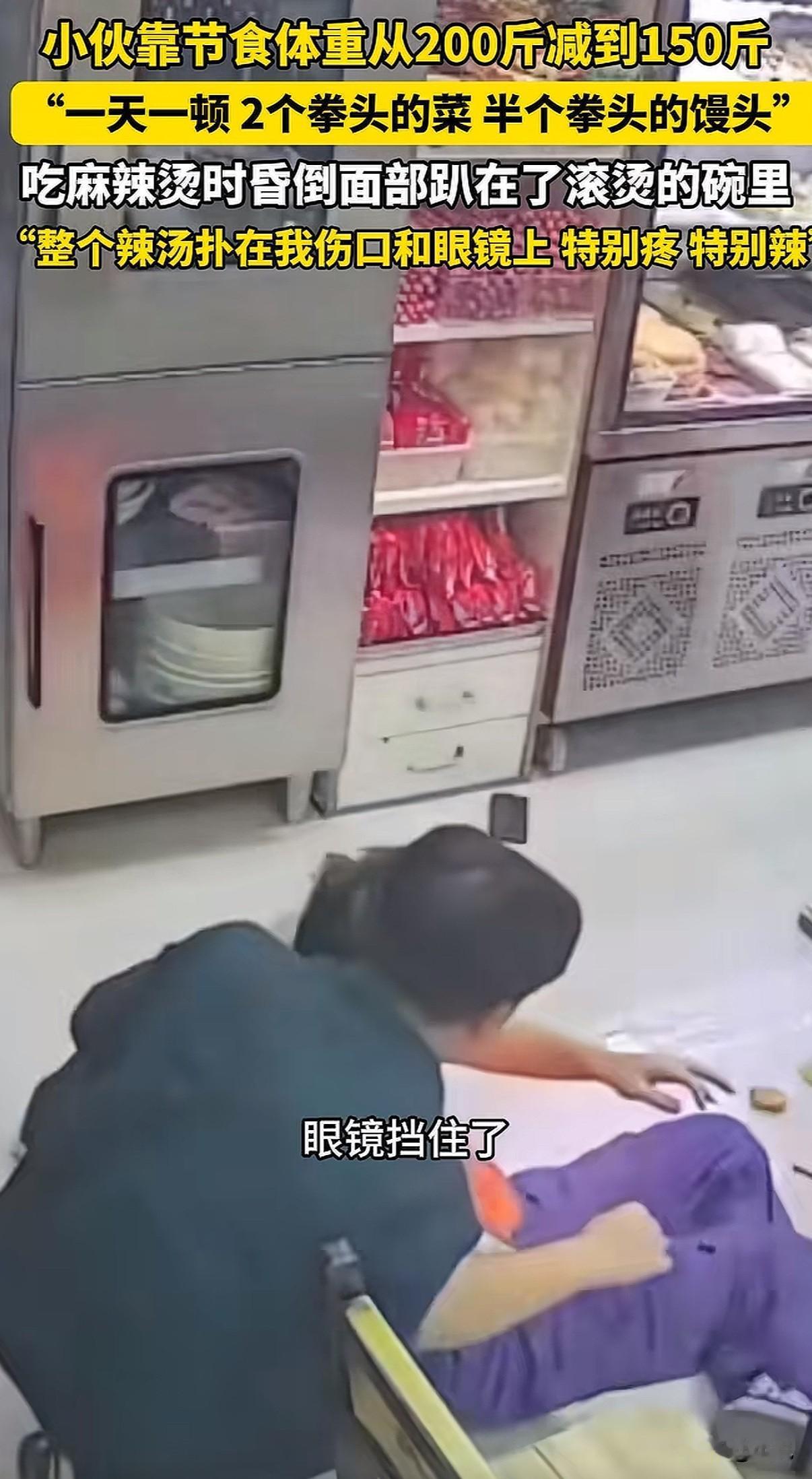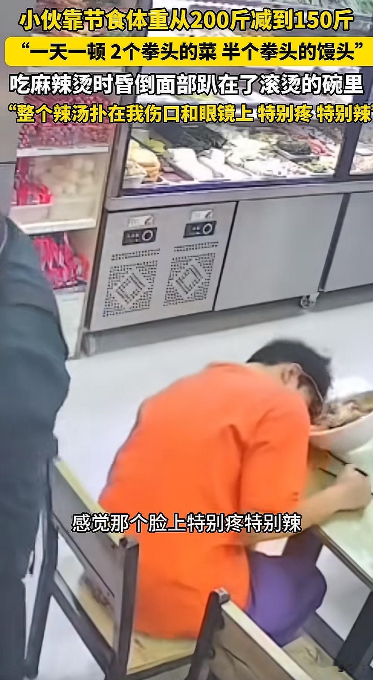 千万不要节食减肥!内蒙古包头,一个小伙子9个月减掉50斤,结果吃饭时脸砸进了滚烫的麻辣烫碗里。 之前体重200斤,他减肥的方法就一个:饿。一天只吃一顿,量还特别少,就两拳蔬菜,加上半个馒头。这么吃了九个月,体重是真掉了,掉到了150斤。 那天中午,他走进一家麻辣烫店。可能觉得瘦了这么多,能稍微放松一下。 热腾腾的麻辣烫刚端上来,他拿起筷子。 下一秒,人突然就从椅子上滑下去,脸直接栽进了滚烫的碗里。 整碗滚烫的辣汤,哗一下全扑在他脸上。他戴着的眼镜,镜框被压着嵌进了皮肤,滚烫的辣汤顺着镜片,往烫伤的皮肉里渗。 周围的人全吓呆了。 店主赶紧冲过来,把他扶起来,拼命掐他的人中。过了一阵子,他才慢慢醒过来,脸上已经是通红一片,火辣辣地疼。 送到医院,医生诊断是面部浅二度烫伤。处理伤口的时候,肯定遭了不少罪。 医生问了他的情况,一听他一天的饮食,就说了:这么吃,身体里缺碳水,缺蛋白质,血糖低得厉害。突然吃饭,血管一扩张,大脑供血跟不上,晕倒是很容易发生的。 他这9个月,摄入的热量远远不够一个成年人维持基本运转。身体就像一直低电量运行的手机,看着还能亮屏,其实随时会关机。 减肥减到晕倒,不稀奇。但以这种方式,脸直接埋进热汤里烫伤,真的太意外了。 当时店里的人回忆,就听见“咚”一声闷响,回头一看,人已经趴桌上了,碗都打翻了。 他的眼镜是个金属细边的,烫软的皮肤被镜框勒出深深的印子,辣汤里的油和佐料,混着伤口,清洗起来都麻烦。 为了瘦,能把每天的食物压缩到那么一点点,这得有多强的意志。可这份意志,最后却用来自伤了。 现在他脸上包着纱布,减肥是“成功”了,但脸上可能会留下印记。不知道他会不会觉得,这代价有点太大了。 很多人减肥,都想快,恨不得一天一个样。网上也到处是极端节食的所谓“经验”。 但人的身体,不是一口就能吹起来的气球,也不是一下就能扎破的。它需要平衡,你猛地抽掉它的支撑,它一定会找机会报复回来。 这次是晕倒在麻辣烫店,下次万一晕倒在马路上呢? 瘦,应该是一件让身体更轻松、更健康的事,而不是一场以健康为赌注的冒险。 他的故事,像一面有点刺眼的镜子。照出了很多人心里那种“只要瘦,咋都行”的急切。 镜子里的自己好看了,镜子外的自己却躺进了医院。这到底值不值,每个人心里都有杆秤。