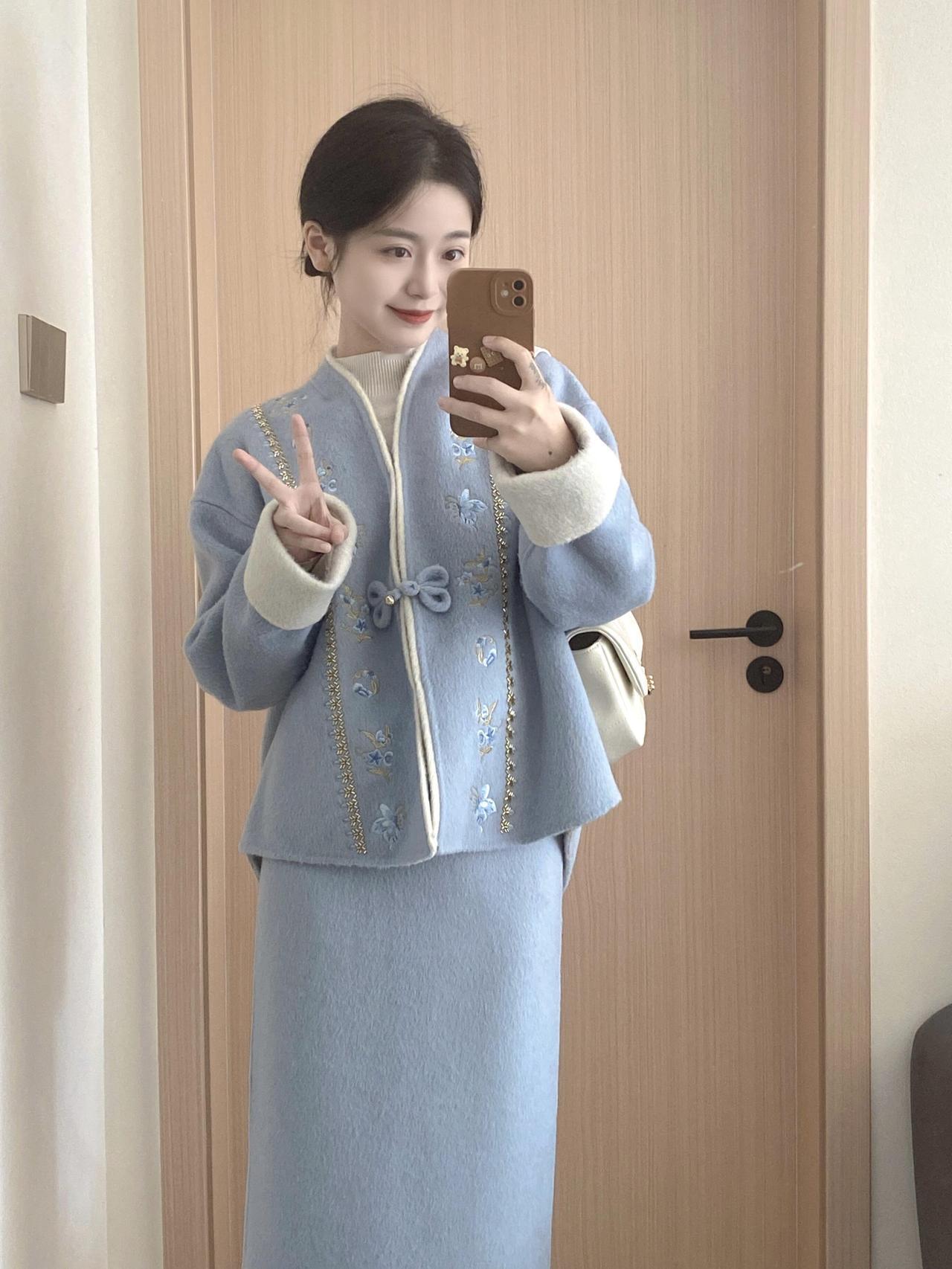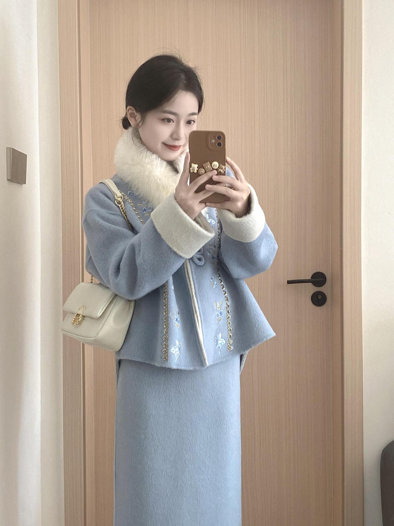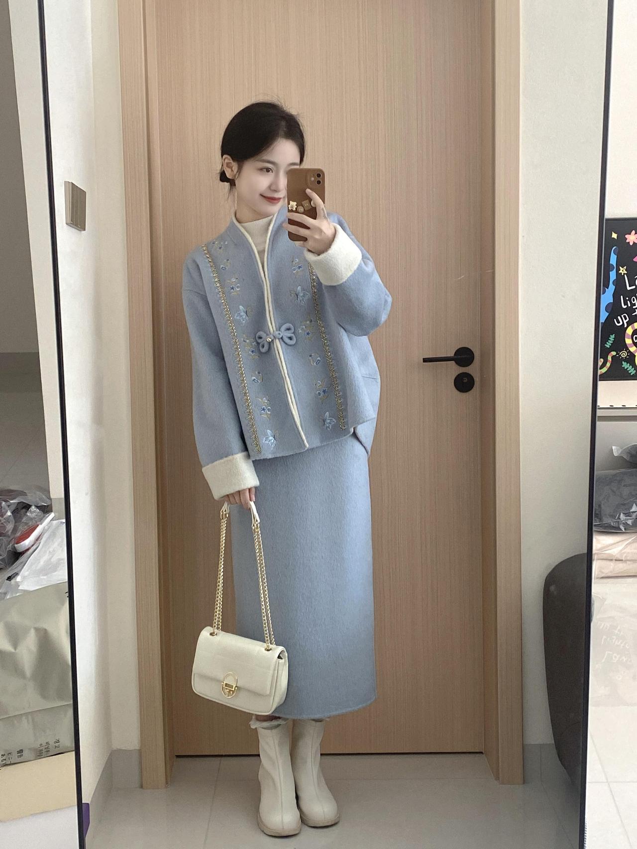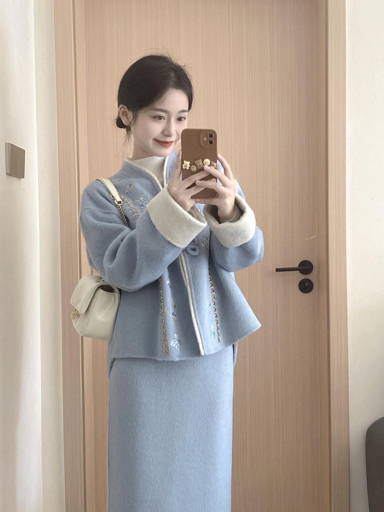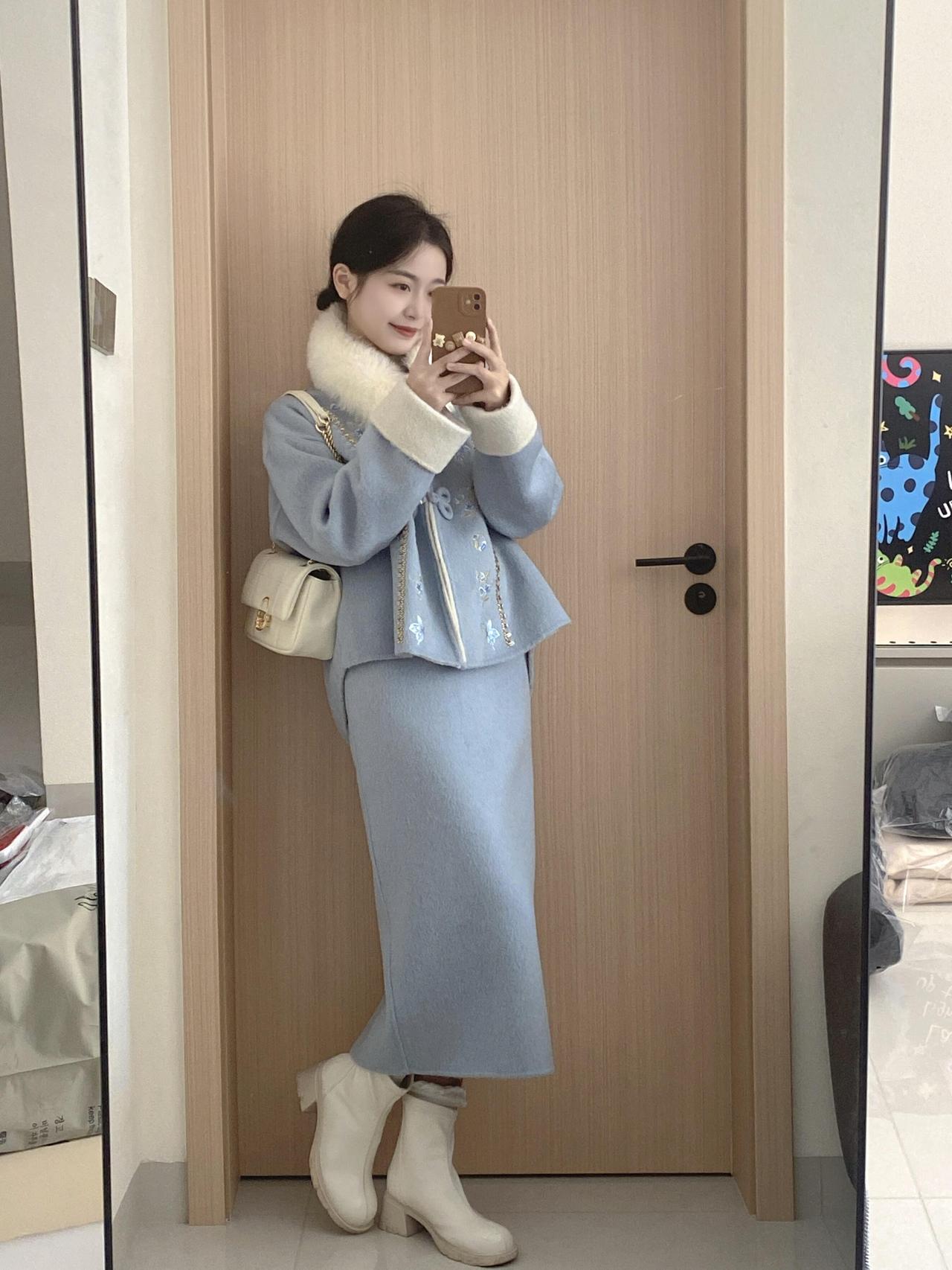 优雅气质穿搭,蓝色背景下的时尚自拍