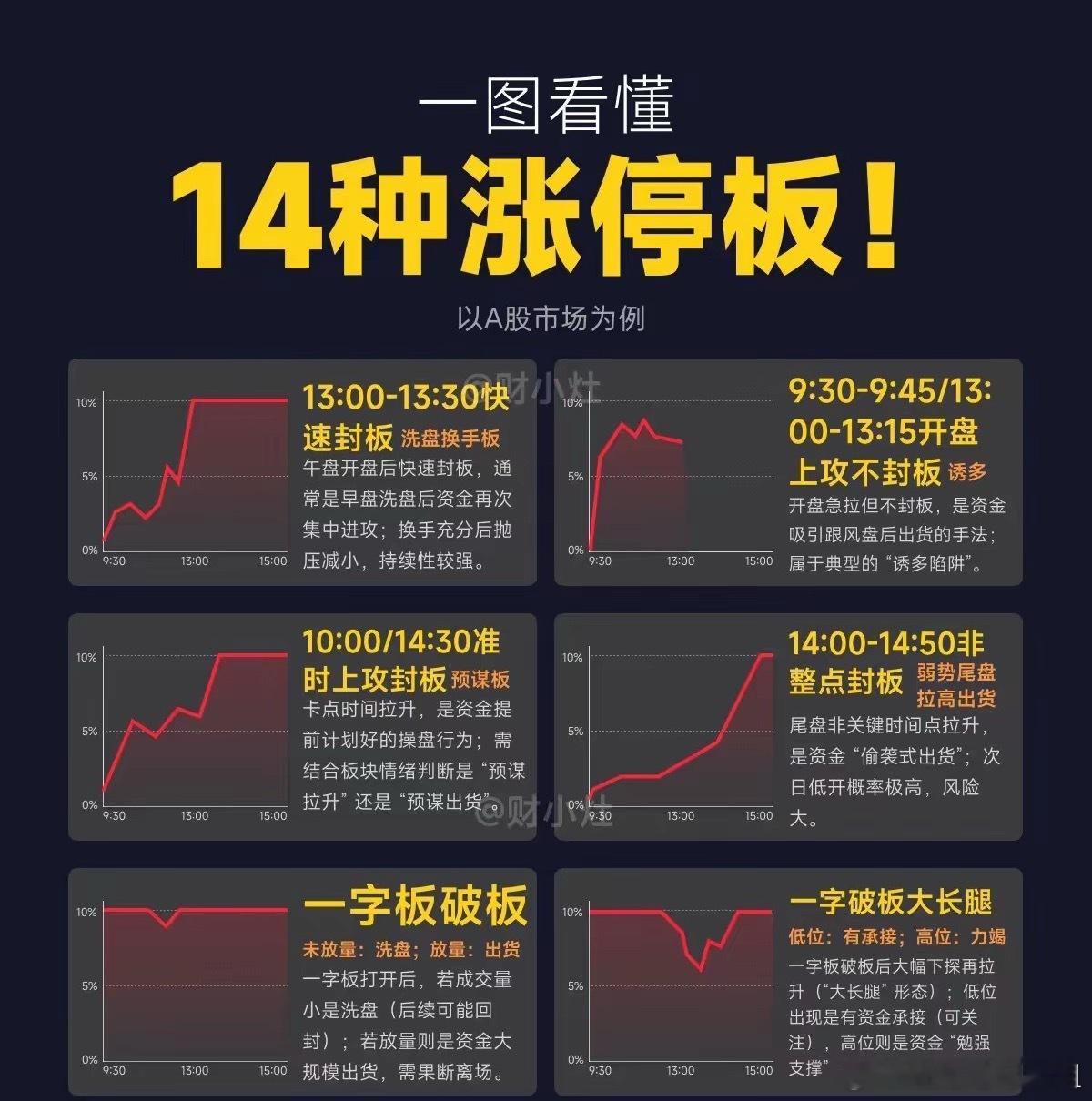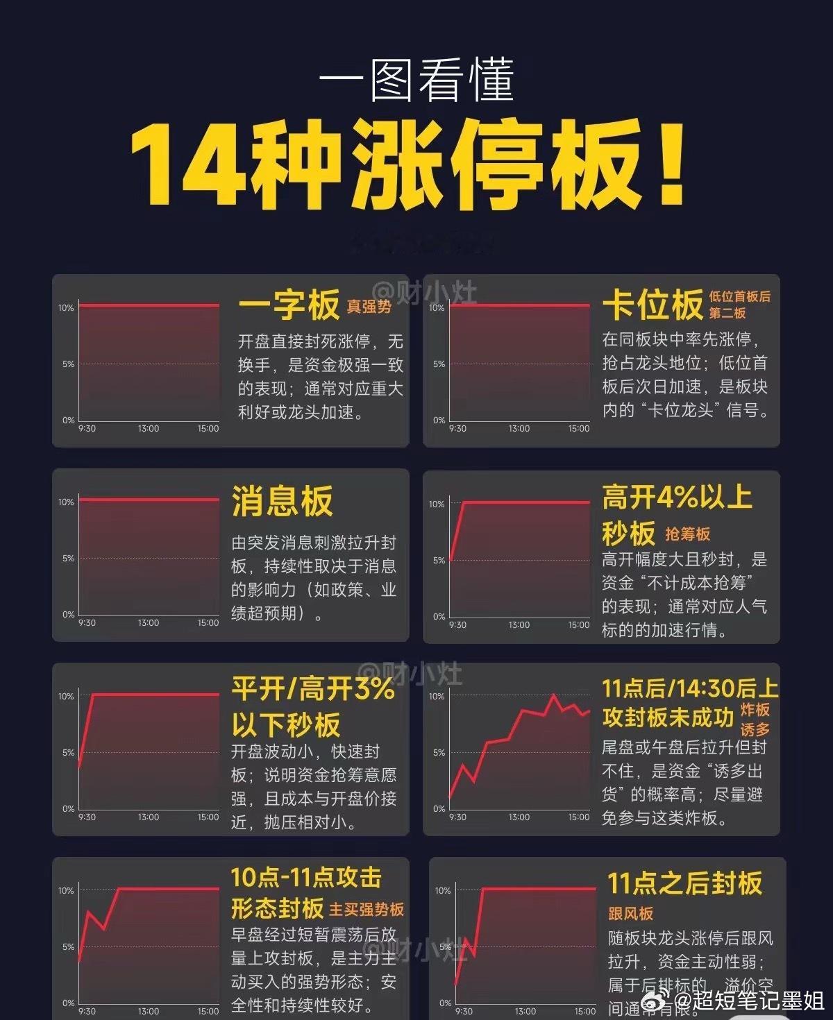 14种涨停1.一字板(最强势)2.卡位板3.消息板4.高开4%以上秒板(抢筹板)5.平开/高开3%以下秒板6.炸板诱多板7.10点-11点攻击形态封板(主买强势板)8.11点之后封板(跟风板)9.速封板10.开盘上攻不封板(诱多)11.卡点上攻封板(预谋板)12.非整点封板(弱势尾盘)13.一字板破板14.一字破板大长腿