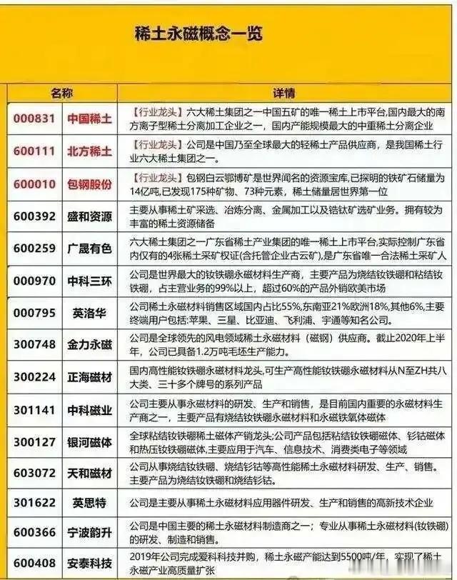 A股:下周行情已经确定,领涨板块周五强势突破,强势股直线拉涨停,重大利好落地,板块龙头股全分享,散户小白看过来!稀土永磁板块的机会来了!周五板块指数高开高走,震荡走强,午后14:20开始出现直线拉升,板块指数大涨2.28%,板块中宁波韵升直线涨停,金力永磁盘中一度大涨15%、中科三环盘中涨停,板块中个股普涨,而且稀土永磁板块近期经历了持续2个月的调整行情,有望开启一波突破走势,需要重点关注!据市场消息称,金力永磁、中科三环、宁波韵升已获得通用出口许可证。此外,更早的2025年5月,也有报道指出至少六家稀土磁材企业获得了出口许可证。而在2025年9月至12月期间,正海磁材、大地熊、天和磁材、英斯特和厦门钨业等也被提及获得了相关许可证或资质。值得一提的是,商务部新闻发言人何亚东4日表示,中国政府依法依规开展稀土相关物项出口管制工作。只要是用于民用用途的、合规的出口申请,中国政府都及时予以了批准。由此可见,随着国际贸易形势的逐步缓和,中国稀土出口有望常态化,量增价涨将是大势所趋,稀土永磁板块当前调整充分,政策积极,业绩爆发的概率大,年报大幅预增将是大概率事件,年报行情值得期待!稀土永磁板块15大核心概念股全分享,散户小白看过来!