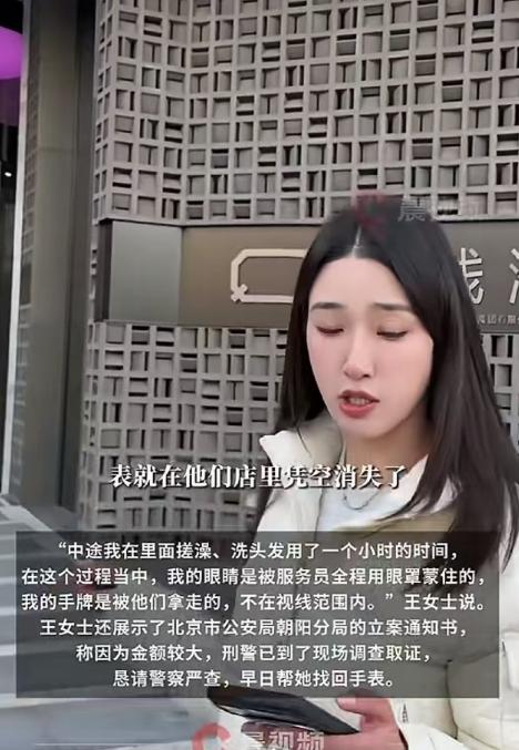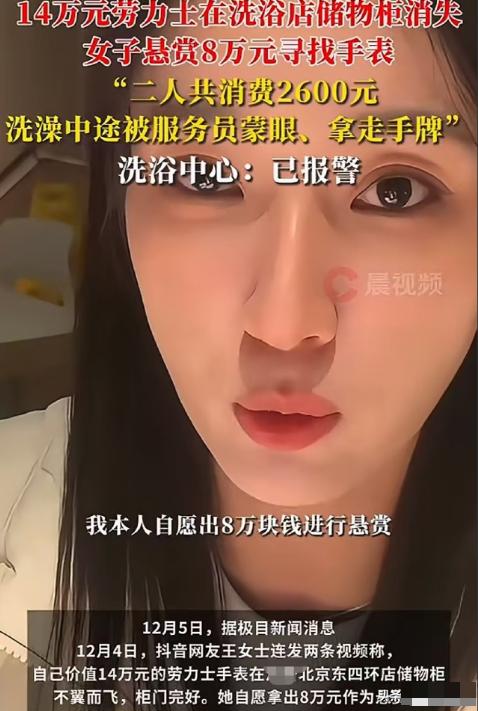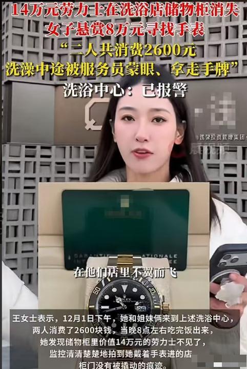 12月5日,北京,女子去北京游玩期间,花2640元去洗浴中心放松,洗澡期间店员将她的眼睛盖住拿走了她的手牌,结束后女子发现储物柜里价值140000元的劳力士不见了,奇怪的是柜门完好无损,根本没有撬动的痕迹。因手表意义非凡,女子悬赏8万寻找线索。   “我花两千多来放松,十几万的表直接没了!这哪是洗浴中心,分明是抢钱!” 王女士(化名)攥着手里完好无损的储物柜钥匙,声音里满是怒气。   12 月初的北京,刚结束三天游玩行程的王女士想着用一场洗浴驱散疲惫。她和姐妹选了家开在东四环的高端洗浴中心,两人扫码付了 2640 元的账单后,跟着店员进了更衣室。   换好衣服锁上储物柜时,她特意把那只戴了五年的劳力士塞进隔层 —— 这块表是父亲送的结婚礼物,市面价值 14 万,对她来说比钱更重。   洗完澡披着浴袍出来时,王女士被迎面走来的店员拦住,对方说要带她去做免费的头部护理。走到护理区门口,店员突然递来一只蒸汽眼罩,说 “做护理得遮光”,不由分说就盖在了她眼睛上。   王女士没多想,由着对方扶着自己走了几步,直到在护理床躺下才摘了眼罩。这过程里,她揣在浴袍口袋里的储物柜手牌被人轻轻抽走,又悄无声息地塞了回来 —— 她当时正闭着眼放松,丝毫没察觉。   两个小时后,王女士准备离开,打开储物柜的瞬间僵在原地:隔层里的劳力士不见了。   她第一反应是自己记错了放的位置,把柜子翻了三遍,连角落的缝隙都摸过,还是空的。更让她后背发寒的是,储物柜的柜门严丝合缝,锁扣没有任何撬动的痕迹,就像有人拿着匹配的钥匙,光明正大地开了锁。   她立刻找洗浴中心负责人,对方调看监控时却 “卡了壳”:更衣室的摄像头恰好对着墙角,储物柜区域是盲区;护理区的监控则显示,给王女士戴眼罩的店员,在她躺下后曾拿着一张手牌往更衣室方向走,只是走廊的监控 “刚好坏了”。     王女士气得浑身发抖,当天就报了警,拿到受案回执的同时,她在社交平台发了一条动态:“谁能提供找回手表的线索,我直接给 8 万 —— 这表对我来说,不是钱能衡量的。”   这条视频刚发出去就炸了锅。   有网友翻出这家洗浴中心的评价,发现三个月前就有顾客说 “手牌被店员借走后丢了东西。”   还有人吐槽 “高端店的管理比小澡堂还乱,连手牌都能随便拿。”   更多人替王女士着急:“这店员明显是踩点了,盖眼罩就是为了偷手牌,太嚣张了。”   截至目前,警方已经介入调查,洗浴中心负责人只说 “会配合处理”,却没给出具体的说法。王女士每天都盯着手机,生怕错过任何一条线索 —— 那只表的表带上,还留着父亲生前帮她调表带时划的一道浅痕。   这件事也提醒了我们:出门在外,别觉得 “高端场所” 就等于 “安全”,贴身物品要么随身带,要么别离开视线;遇到有人以 “服务” 为名遮挡你的感官,第一时间就得警惕 —— 毕竟,再放松的场合,也不能把安全感全交给别人。   你遇到过类似的 “隐形套路” 吗?评论区说说你的经历,给大家提个醒吧。