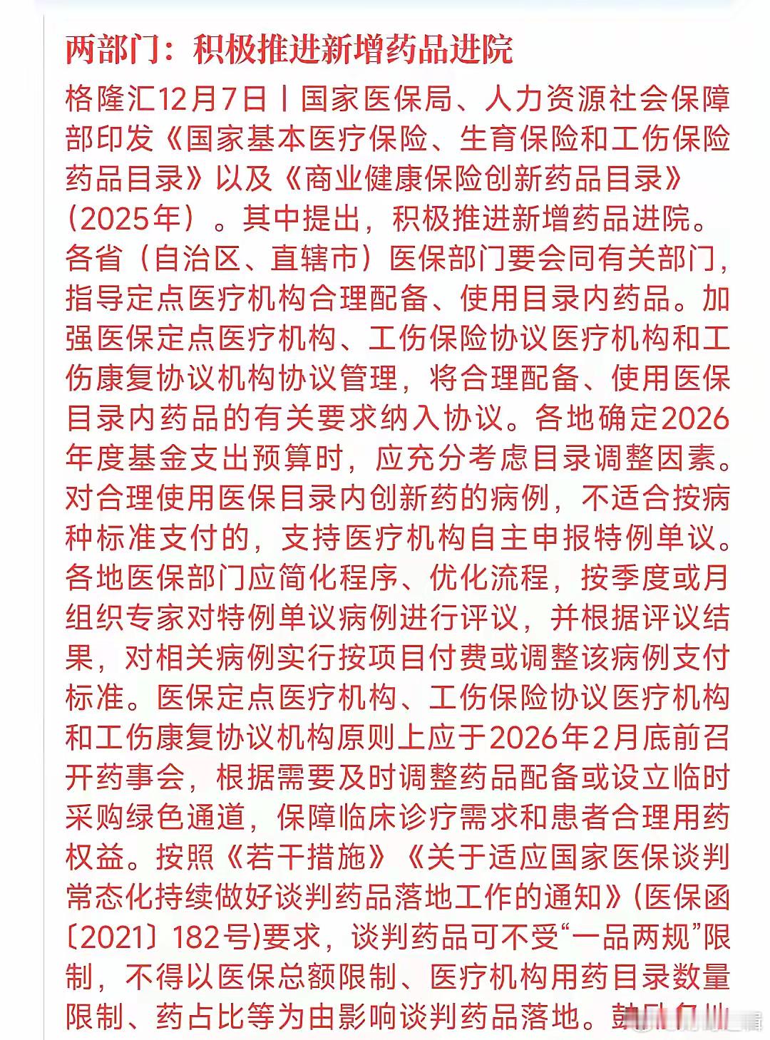 周末医药板块迎来重大利好,明天医药板块基本稳了2025年新版医保目录新增的114种药(含50种一类创新药)和首版商保创新药目录里的19种药能尽快进医院,尽早的能够让患者用上。对于114种药的厂商来说,这就是销量的提升,进了医院就是销量的保证,业绩当然也会随着提升。今年就是创新药的一年,上半年大力的政策扶持创新药的研发,下半年就已经能够让创新药进入商业化了,这对于患者和公司来说是双赢的局面。今年创新药板块基本已经翻倍了,进入商业化是最后一步,预计基本上已经打满了,短期内医药板块还有涨一波的可能。