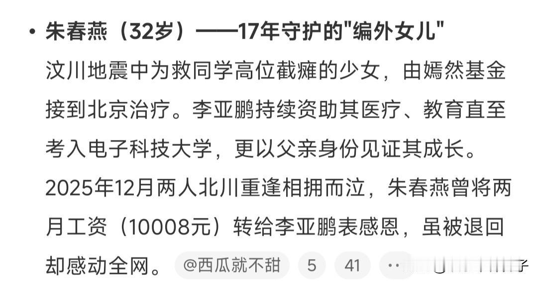 李亚鹏说,我在四川还有一个女儿,算上童童、夏夏和嫣儿,以及这个不太为人知的女儿,我有“四个女儿”! 说实话,看到李亚鹏晒出的视频开头,有点小惊讶,就连一旁的工作人员都有些难以置信,听到有“第四个女儿”,坦言感觉像个吃瓜群众。 李亚鹏后续解释,“第四个女儿”名字叫朱春燕,当年在汶川地震中受伤,不幸双腿截肢,于是帮女孩承担了手术费用。 这一次,李亚鹏特意去看望春燕,见面后,女孩激动的哭了,或许是感恩和幸福的泪水,看到这一幕,真的好感动。 有一说一,通过这件事,真的对李亚鹏真的刮目相看。 有些人觉得李亚鹏一事无成,投资总是失败,婚姻也经营的不好,其实,看一个人,主要还是靠人品,能救助一个素不相识的女孩,还当成女儿一样看待,家人就更不用多说了。 作为一个公众人物,有爱心,有责任感,实属难能可贵,只想说一句,李亚鹏真是好样的,够爷们!